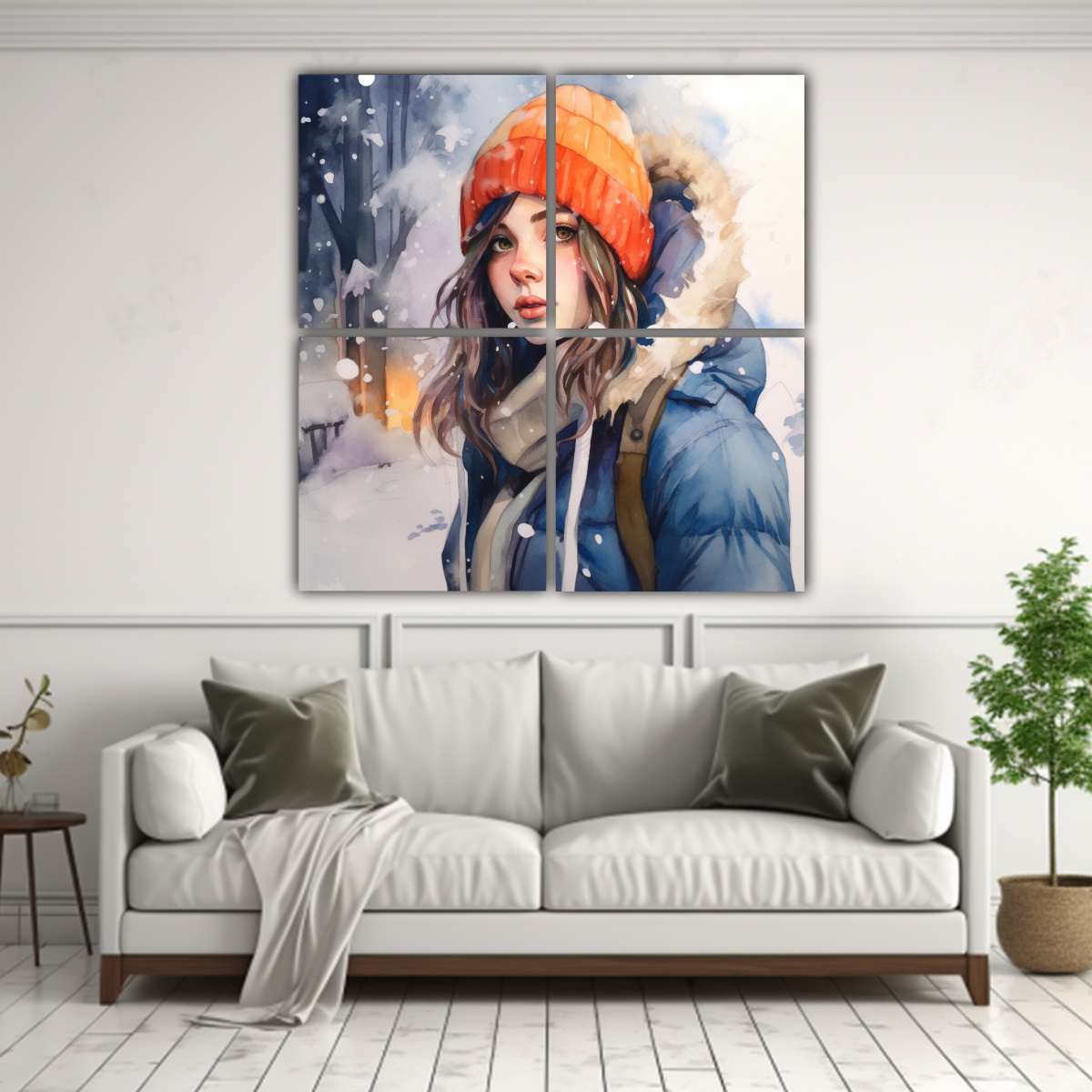 Este cuadro de invierno en acuarela se vería perfecto en tu sala de estar Colócalo sobre el sofá para crear un ambiente acogedor y moderno Combínalo con cojines en tonos gris y azul marino para resaltar los colores del cuadro ¡Será el punto focal de tu decoración!