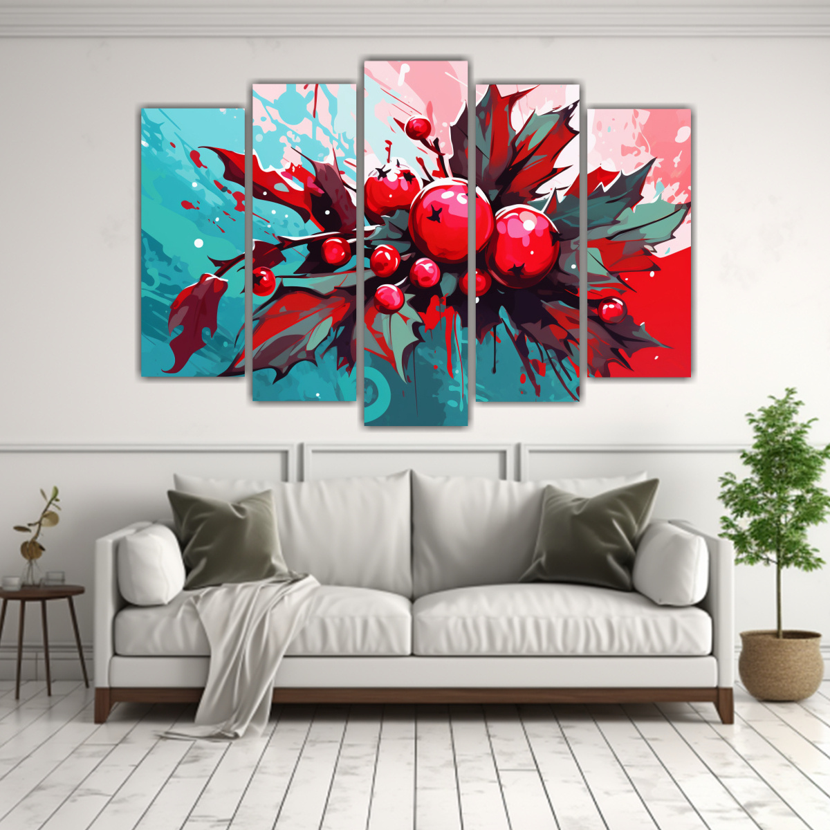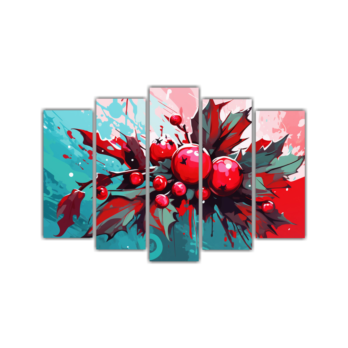 Pinturas Decorativas Políptico Hojas De Acebo Rojas Atmosfera Neonoir Neo Pop