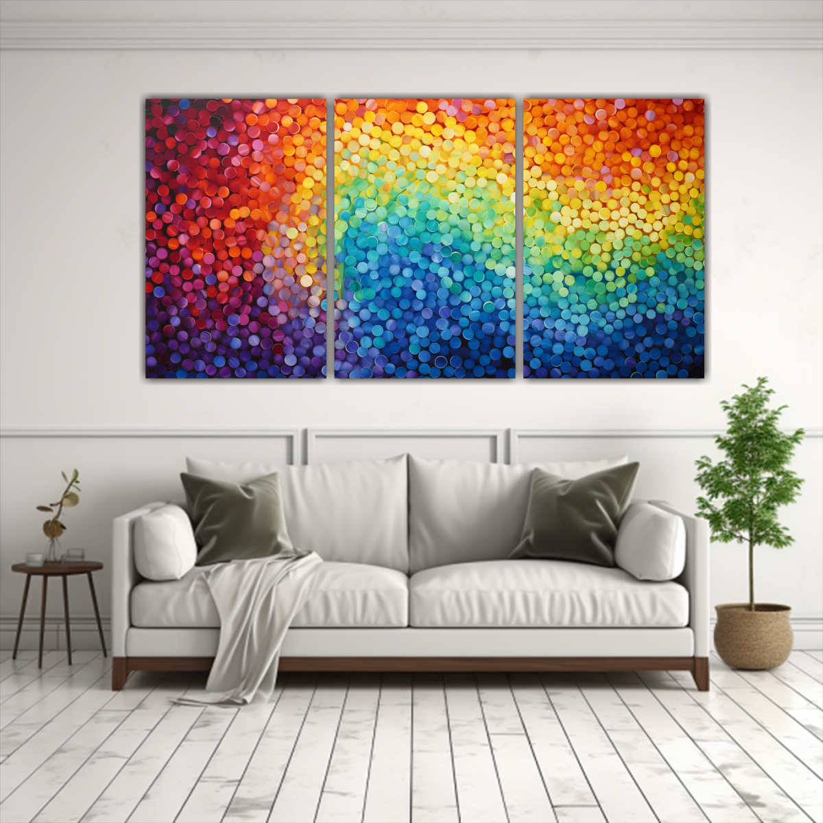 Este cuadro de ‘Pinturas decorativas que fusionan el puntillismo con el vibrante arcoíris visual abstracto’ sería perfecto para decorar una sala de estar moderna Colócalo sobre un sofá de color neutro para que los colores resalten, y combínalo con cojines en tonos plateados, dorados y turquesas Agrega una alfombra gris y cortinas en tonos carmesí para completar la decoración vibrante y elegante