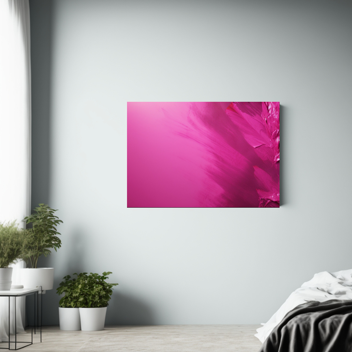 Este cuadro simétrico en tonos magenta sería ideal para colocar sobre un sofá en tonos neutros, como blanco o gris, para crear un contraste llamativo y moderno También puede destacar en una pared de acento en tonos rosados o morados para una atmósfera sofisticada