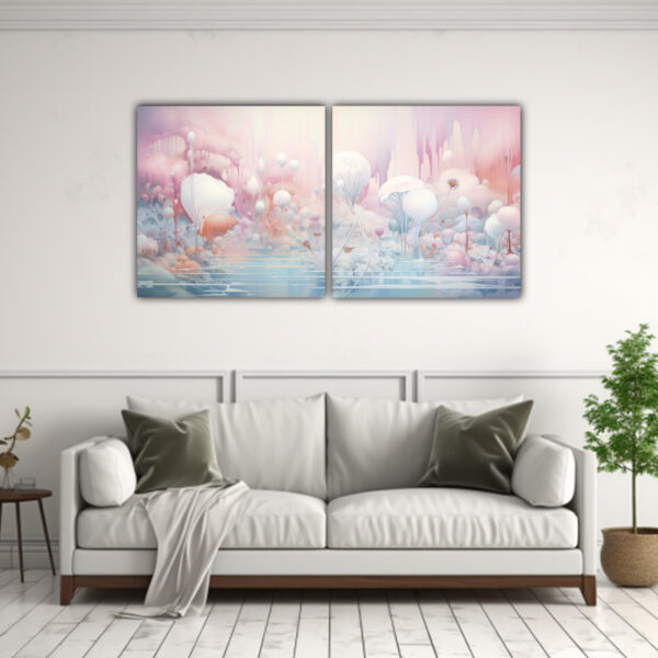 Este cuadro surrealista y llamativo en tonos plateados, grises, beiges y lilas sería perfecto para decorar tu sala de estar o dormitorio Puedes colocarlo sobre un sofá o una cama, creando un punto focal en la habitación Combínalo con accesorios de colores neutros y texturas suaves para lograr un ambiente elegante y relajante