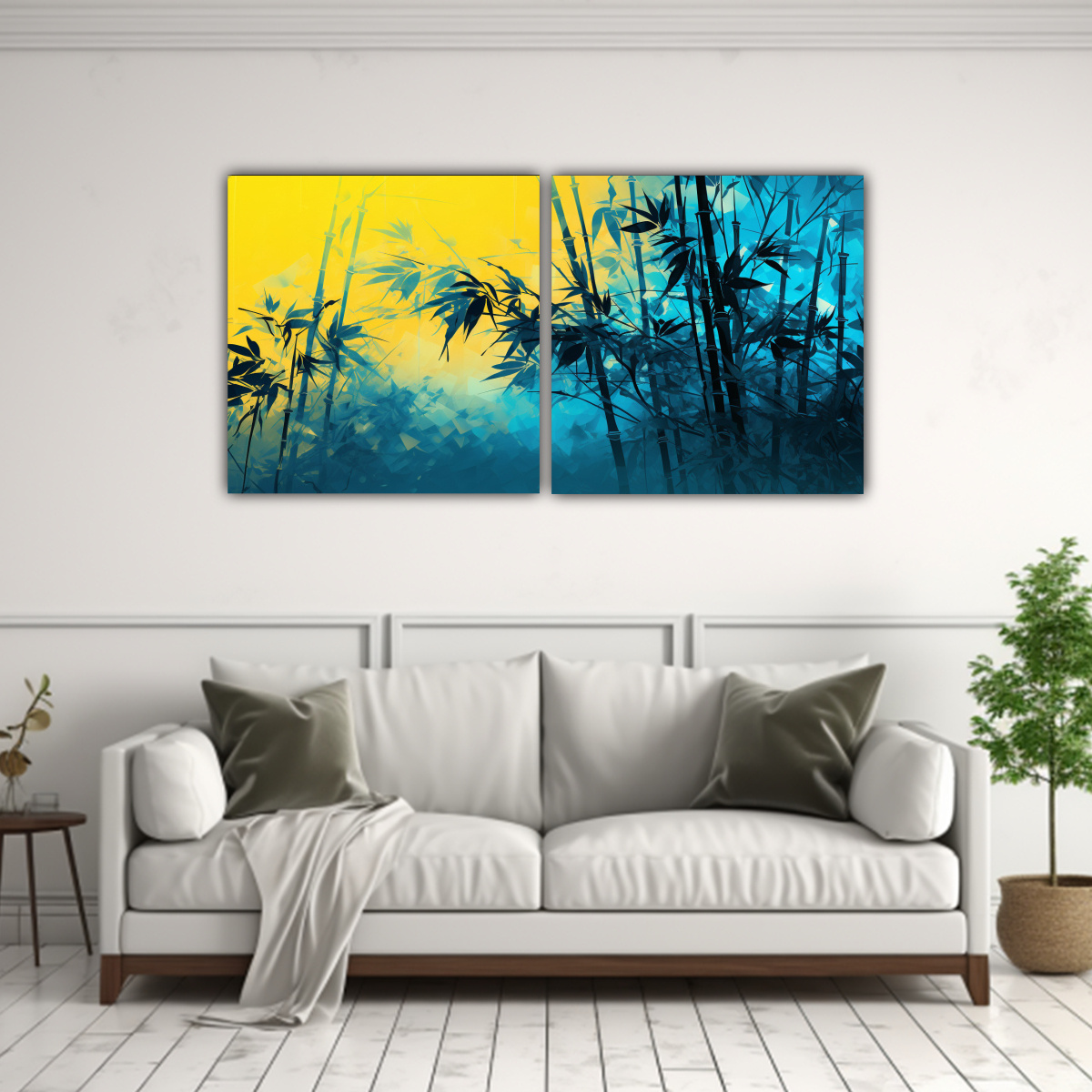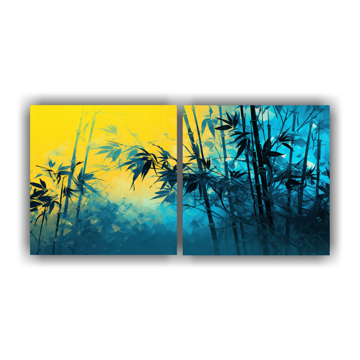 Combina el cuadro de tonos únicos de bambú en amarillo y azul con una decoración minimalista o moderna Colócalo en un salón o dormitorio para agregar un toque de tranquilidad y elegancia