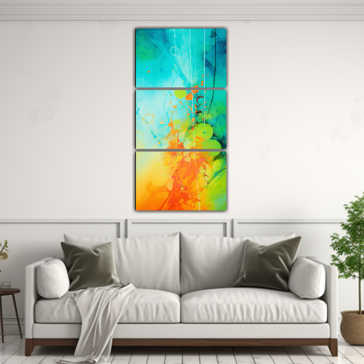 DecoCuadros te presenta el cuadro decorativo verano abstracto Tres Artes Verticales Artesanales Este impresionante diseño en tela de alta calidad con bastidores de madera combina colores como el menta, aguamarina, mostaza, coral, anaranjado, amarillo claro, azul marino grisáceo, verde azulado y plateado Aporta un toque de frescura y vitalidad a tus espacios con esta pieza única Nuestros cuadros son creados con los mejores estándares de calidad y ofrecemos los precios más competitivos en el mercado Aprovecha nuestras entregas rápidas y gratuitas en Santiago y nuestros envíos express a regiones