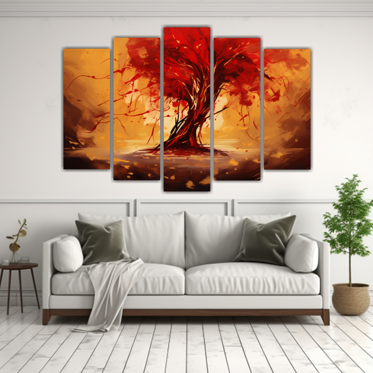Pinturas En Bastidor: Cinco Telas Galería Árbol De Sauce Rojo Y Dorado, Ambiente Neonoir