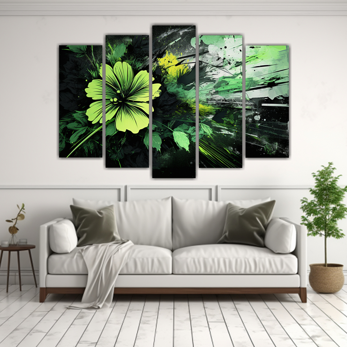 Cinco telas en bastidor que reflejan una atmósfera neo-noir con figuras en verde y negro Colores elegantes como plateado, menta, negro, azul marino grisáceo, gris y dorado Calidad premium a precios accesibles Envíos rápidos y gratuitos en Santiago, y envíos express a regiones