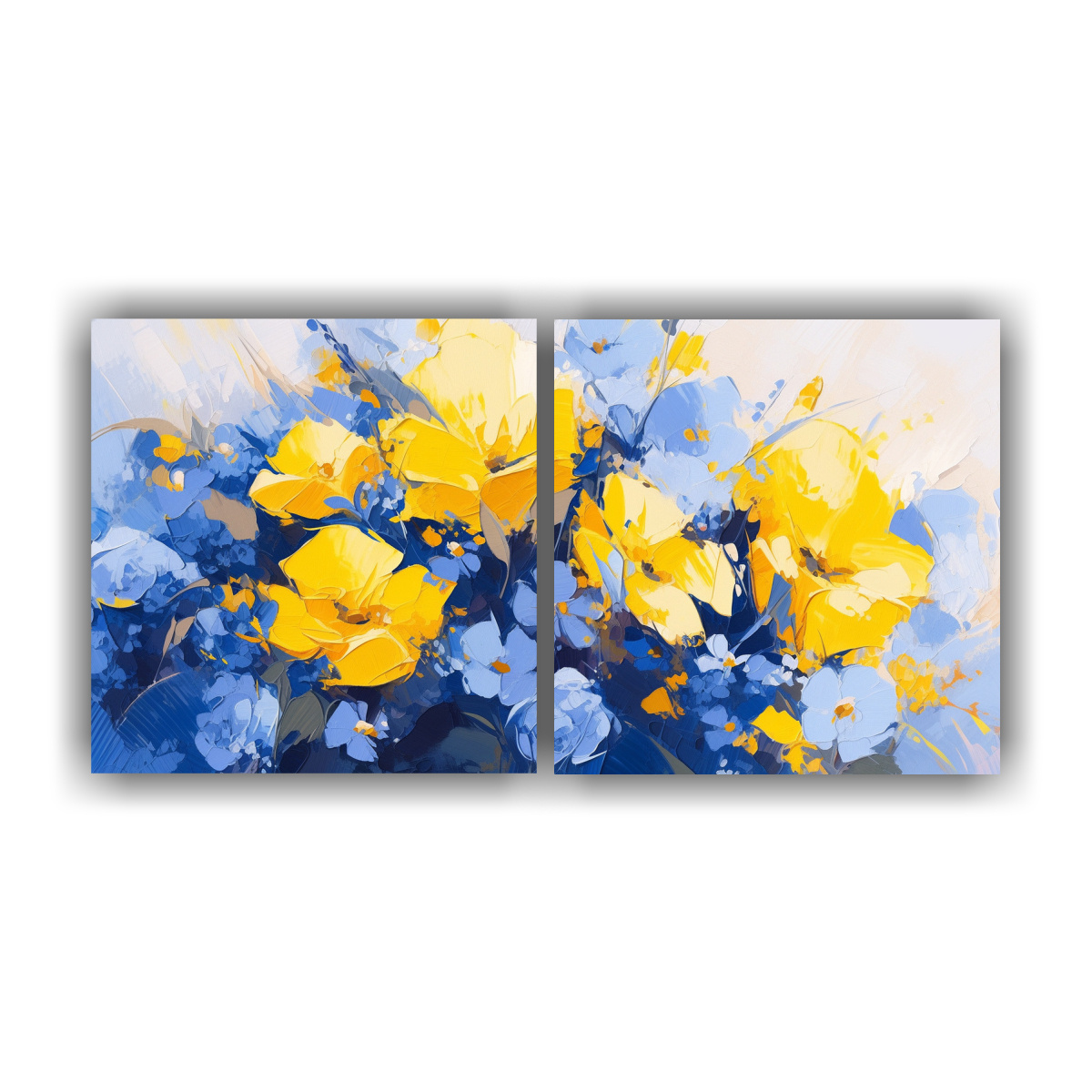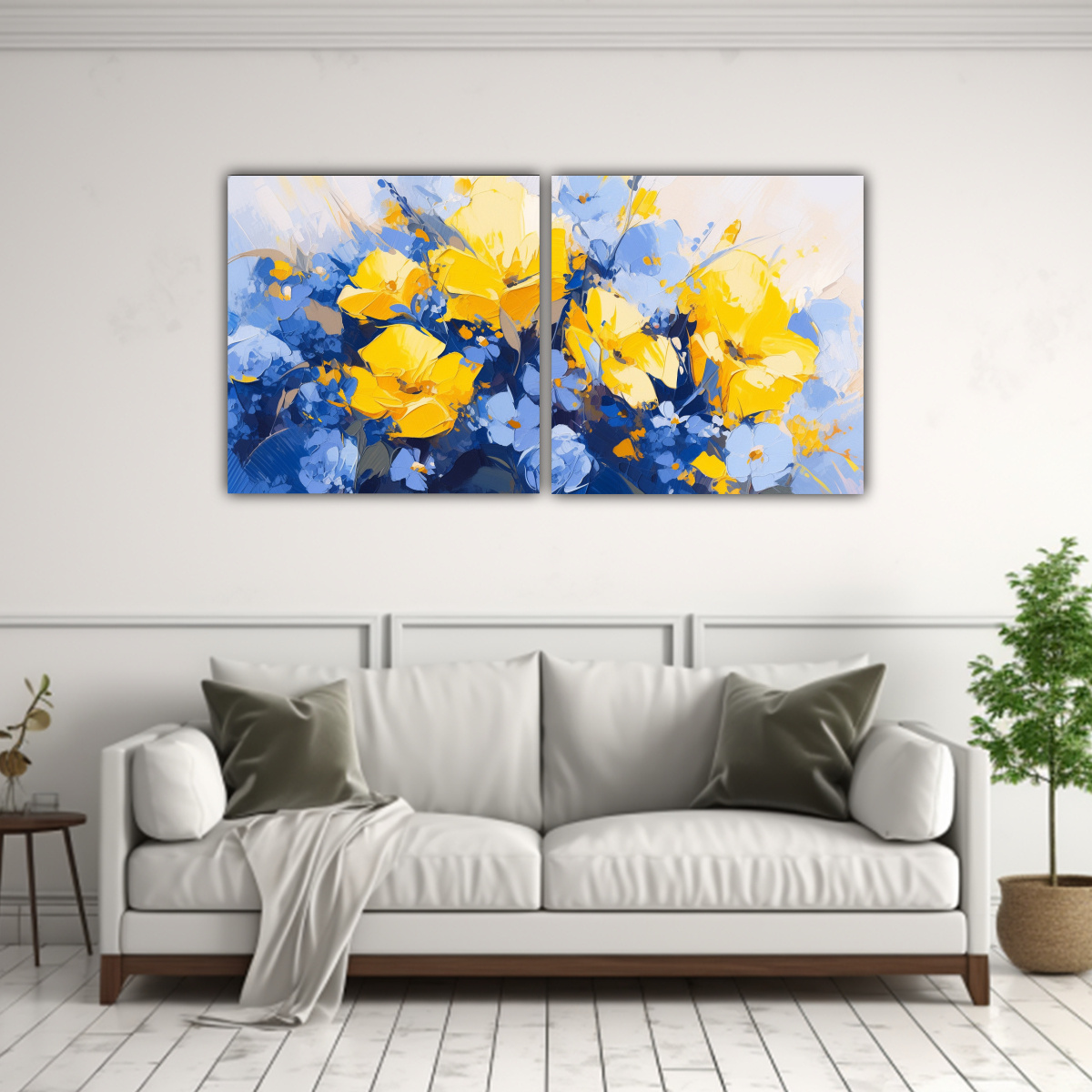 Pinturas En Lienzo De Flores Amarillas Y Azules Con Temática Cálida