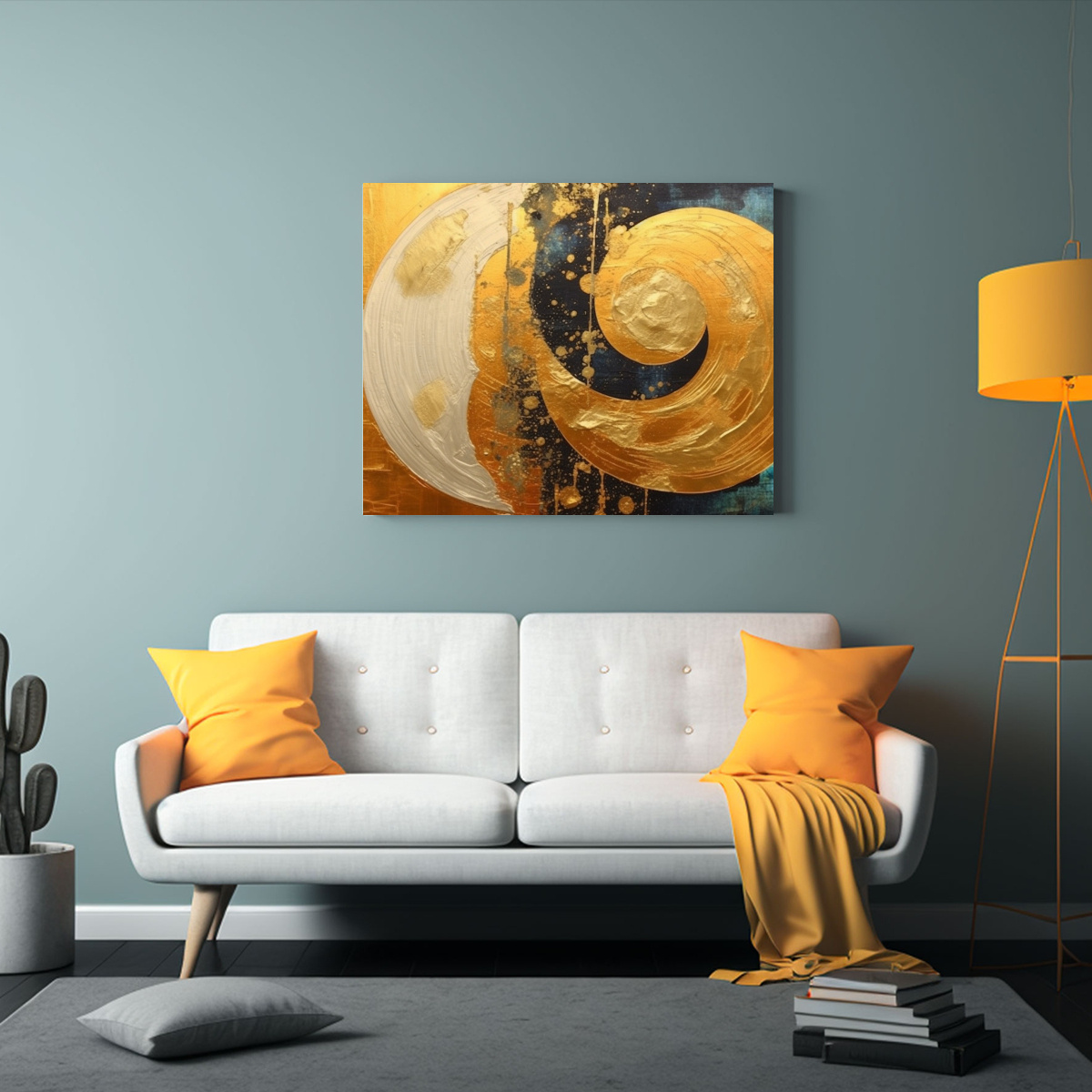 Para destacar este Cuadro Decorativo Circular en Lienzo Dorado, colócalo en una pared de tonos neutros como blanco o gris claro, creando un contraste elegante y sofisticado Complementa con muebles en tonos madera para un ambiente cálido y acogedor