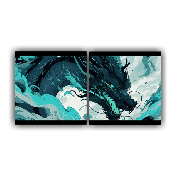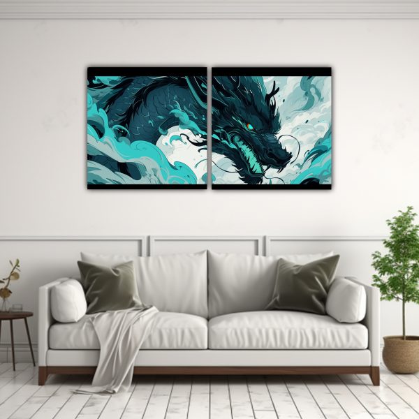 Descubre el lienzo estilo galería de un Dragón en Turquesa y Negro, perfecto para añadir un toque de misterio y elegancia a tu espacio Colores plateado, turquesa, negro y más
