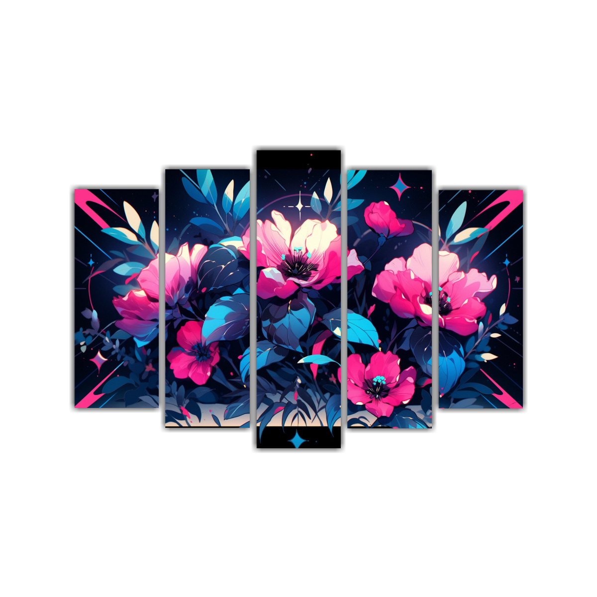 Cinco lienzos de tela creativa que evocan una atmósfera neo-noir con pinceladas medias en tonos como rosado, turquesa, beige, azul marino grisáceo, negro, verde azulado y carmesí Renueva tus espacios con arte de calidad a precios accesibles DecoCuadros garantiza diseños únicos, entrega rápida y gratuita en Santiago y envíos express a regiones