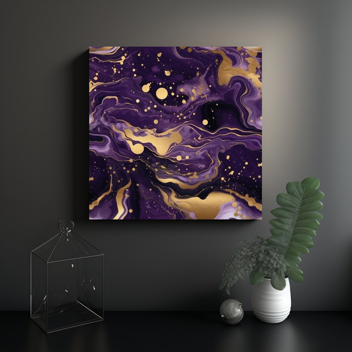 Coloca este cuadro abstracto Dark Purple y Oro en tu sala de estar sobre un sofá gris para crear un contraste elegante y moderno Combínalo con cojines en tonos plateados y azules para resaltar su belleza y agregar un toque de sofisticación a tu decoración