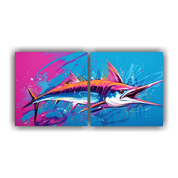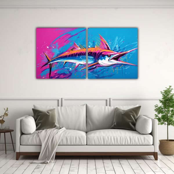 Este cuadro de Marlin azul en colores intenso y rubí se vería espectacular en una pared blanca para resaltar su vibrante paleta de colores Combínalo con muebles en tonos neutros para crear un ambiente moderno y sofisticado Perfecto para salas de estar o áreas de relajación