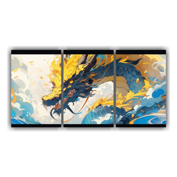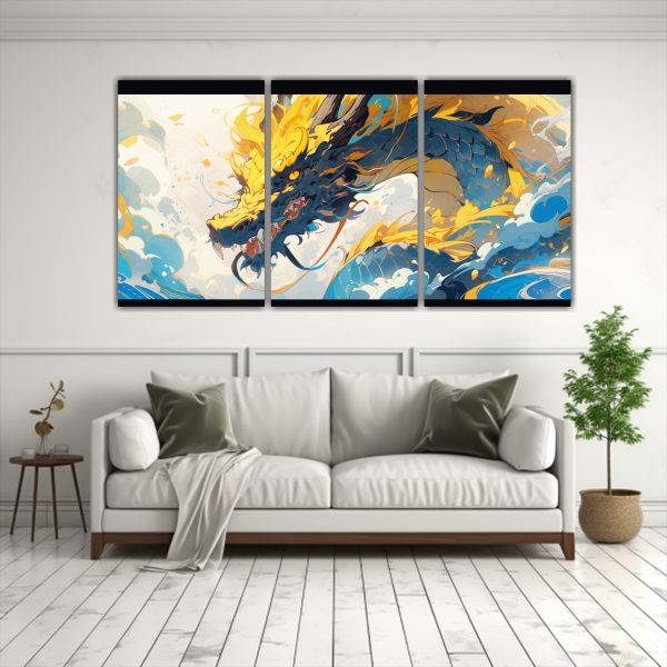 Este cuadro de dragón amarillo y azul se vería perfecto en la sala de estar sobre un sofá gris, creando un contraste moderno y llamativo Combínalo con cojines en tonos dorados y turquesa para una decoración armoniosa y elegante