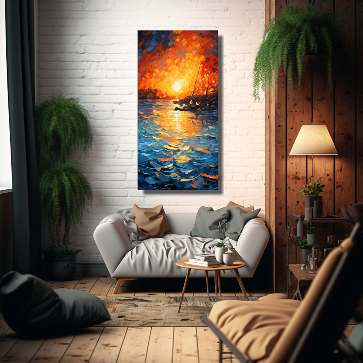 Este cuadro de pinturas modernas en tela sería perfecto para decorar tu sala de estar Su mezcla de naranjas intensos y azules refrescantes le dará vida y energía a tu espacio, creando un ambiente acogedor y sofisticado Combínalo con muebles en tonos neutros como beige o gris, y agrega algunos cojines en los mismos colores para lograr un equilibrio armonioso ¡No esperes más para tener este cuadro único en tu hogar!