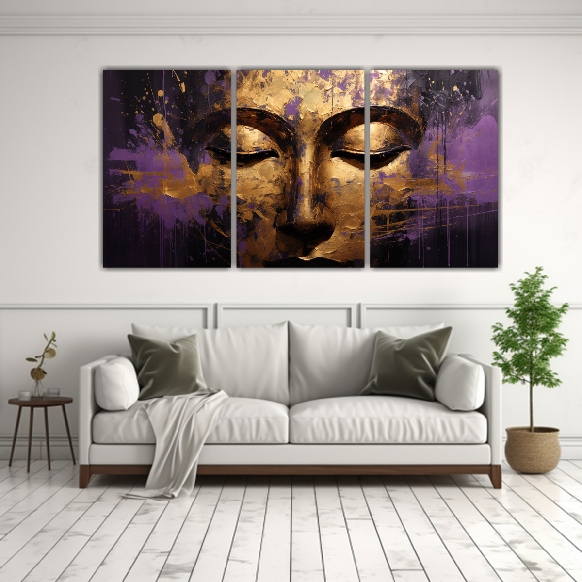 Pinturas Tres Lienzos Vanguardia Buda En Oro Y Púrpura Abstracto De óleo Decorativo Estilo Moderno