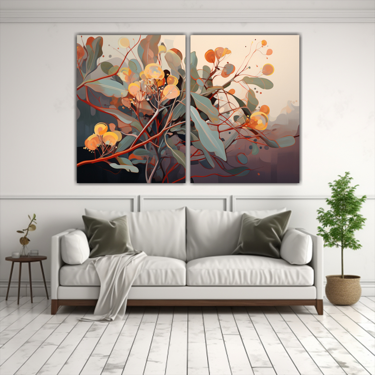 Este cuadro de eucalipto en tonos apagados y atmósfera neonoir es ideal para ubicarlo en la sala de estar o el estudio Combínalo con muebles de colores neutros como beige y gris, añadiendo detalles en tonos coral o carmesí para crear un ambiente sofisticado y moderno ¡Atrévete a darle un toque vintage y elegante a tu espacio con esta pieza única!