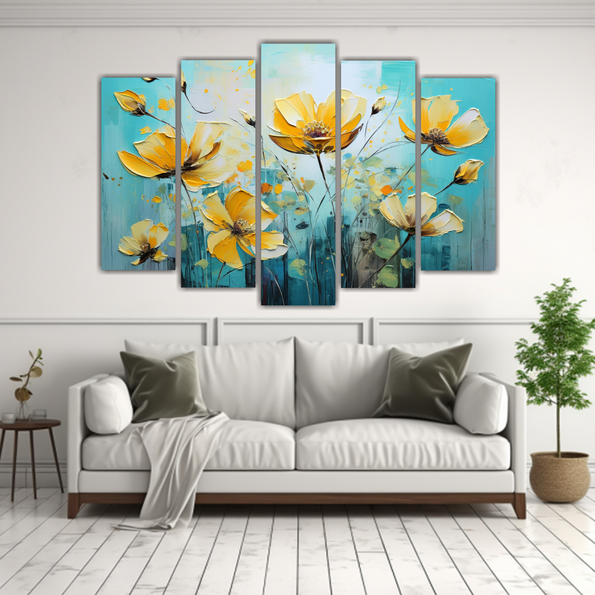 Póster De Arte Urbano Floral Amarillo Y Turquesa En Lienzo.