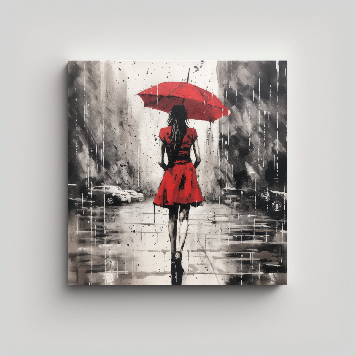 Este cuadro de la pintura de una mujer vestida de rojo caminando bajo la lluvia es perfecto para decorar tu sala de estar o dormitorio Combínalo con muebles en tonos grises y azules para crear un ambiente moderno y sofisticado También puedes colgarlo en la entrada de tu hogar para darle la bienvenida a tus invitados con estilo