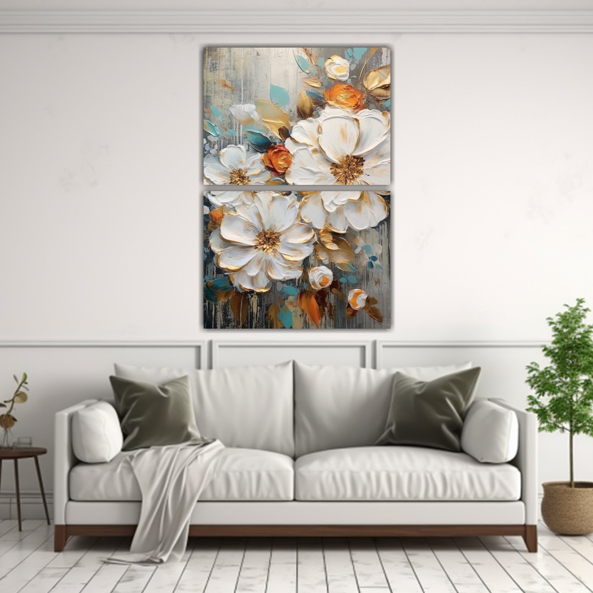 Coloca este set de 2 cuadros con flores blancas, rojas y amarillas en tu sala de estar para crear un ambiente acogedor y elegante Combínalo con muebles en tonos neutros como gris o beige, y agrega cojines en colores similares para lograr una armonía visual También puedes colocarlos en el dormitorio para darle un toque romántico a tu espacio ¡Déjate llevar por la belleza de la naturaleza en tu hogar!
