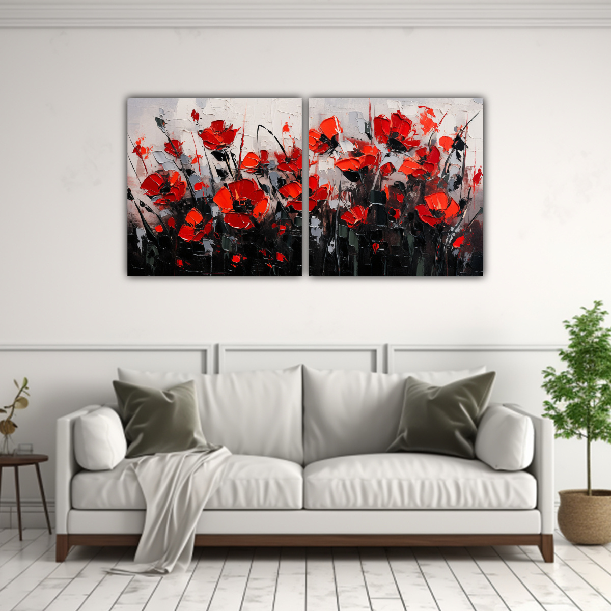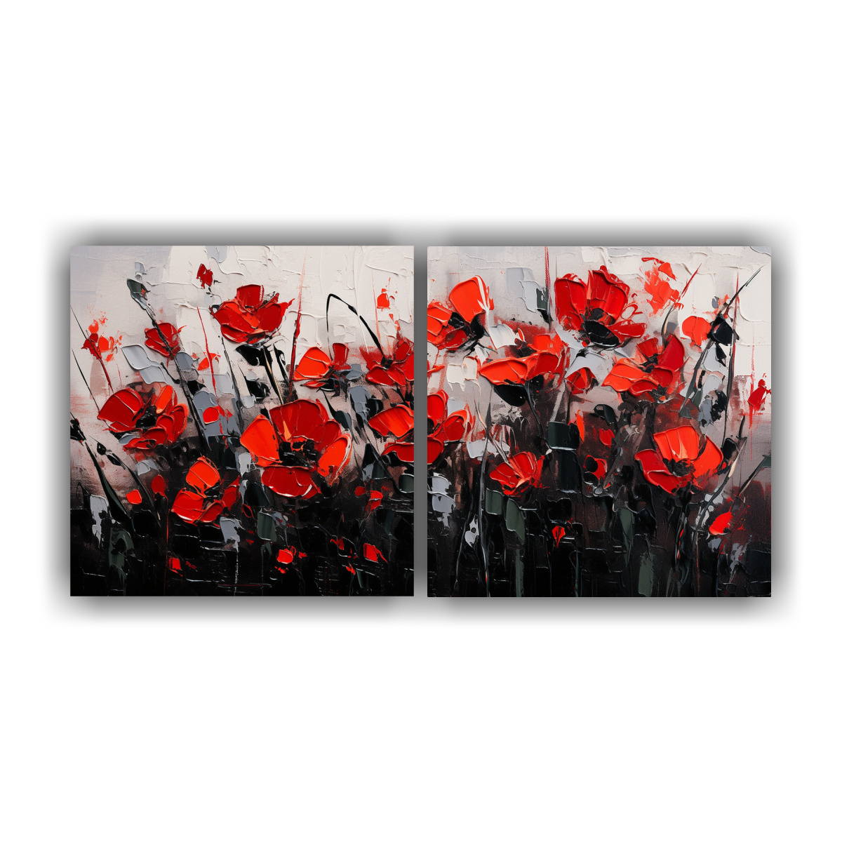 El Set 2 Cuadro Galería Motivo Flores Rojo y Negro en lienzo de DecoCuadros es perfecto para darle un toque de elegancia y color a tu hogar Nuestros cuadros están impresos en tela de alta calidad con bastidores de madera, lo que garantiza durabilidad y resistencia Los colores carmesí, plateado, negro, gris y azul marino grisáceo destacan en esta hermosa obra, brindando un contraste visual único
