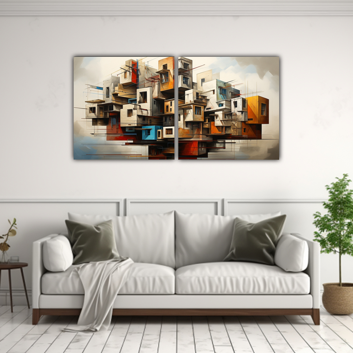 Coloca el Set 2 Cuadros Lienzos Inspiradores: Intensidad de edificios abstractos en la sala de estar para crear un ambiente moderno y sofisticado Combínalos con muebles de tonos neutros y accesorios metálicos para un estilo contemporáneo