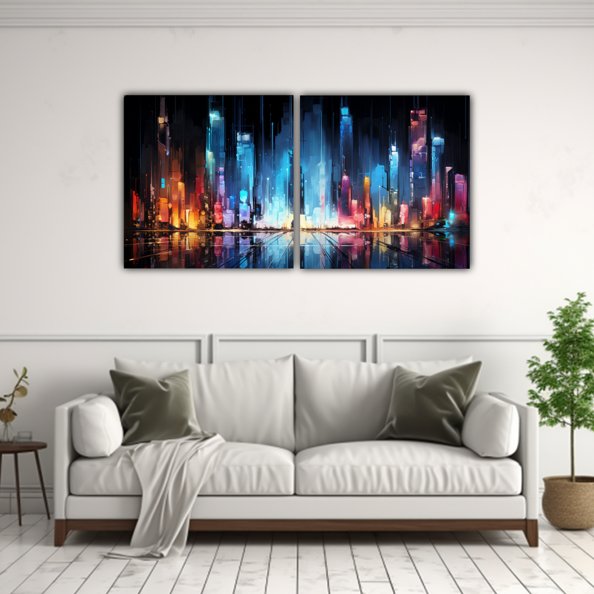 Set 2 Lienzos Escena Abstracta Ciudad En Luces Neón