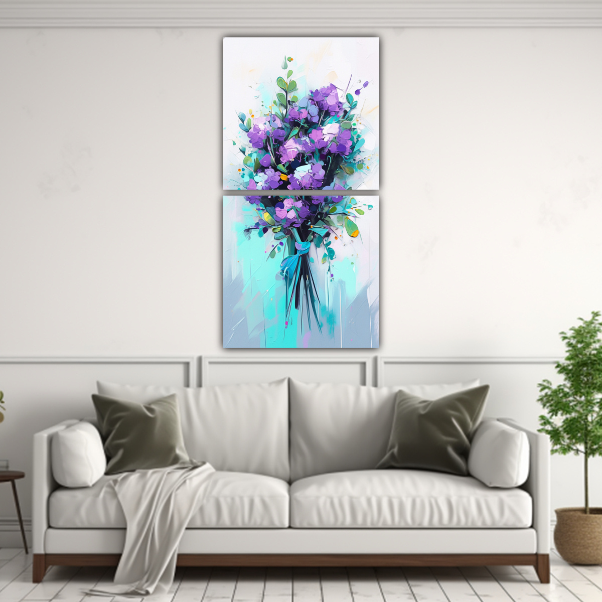 Coloca el Set 2 Lienzos Vanguardia Pintura de flores Morado y Turquesa en tu sala de estar para darle un toque de elegancia y sofisticación Combina perfectamente con muebles de colores neutros como gris, beige o plateado, resaltando así los tonos morado y turquesa de la pintura