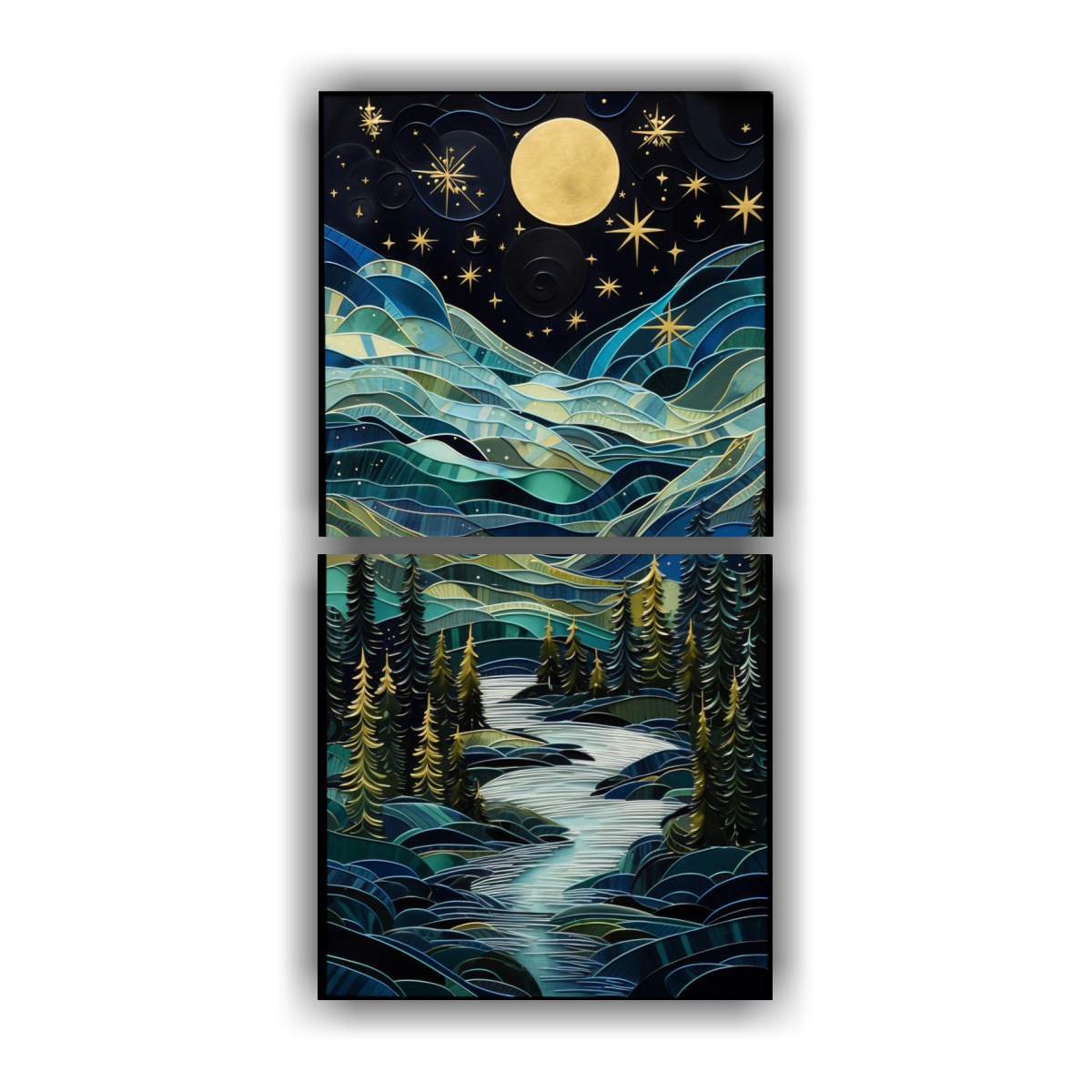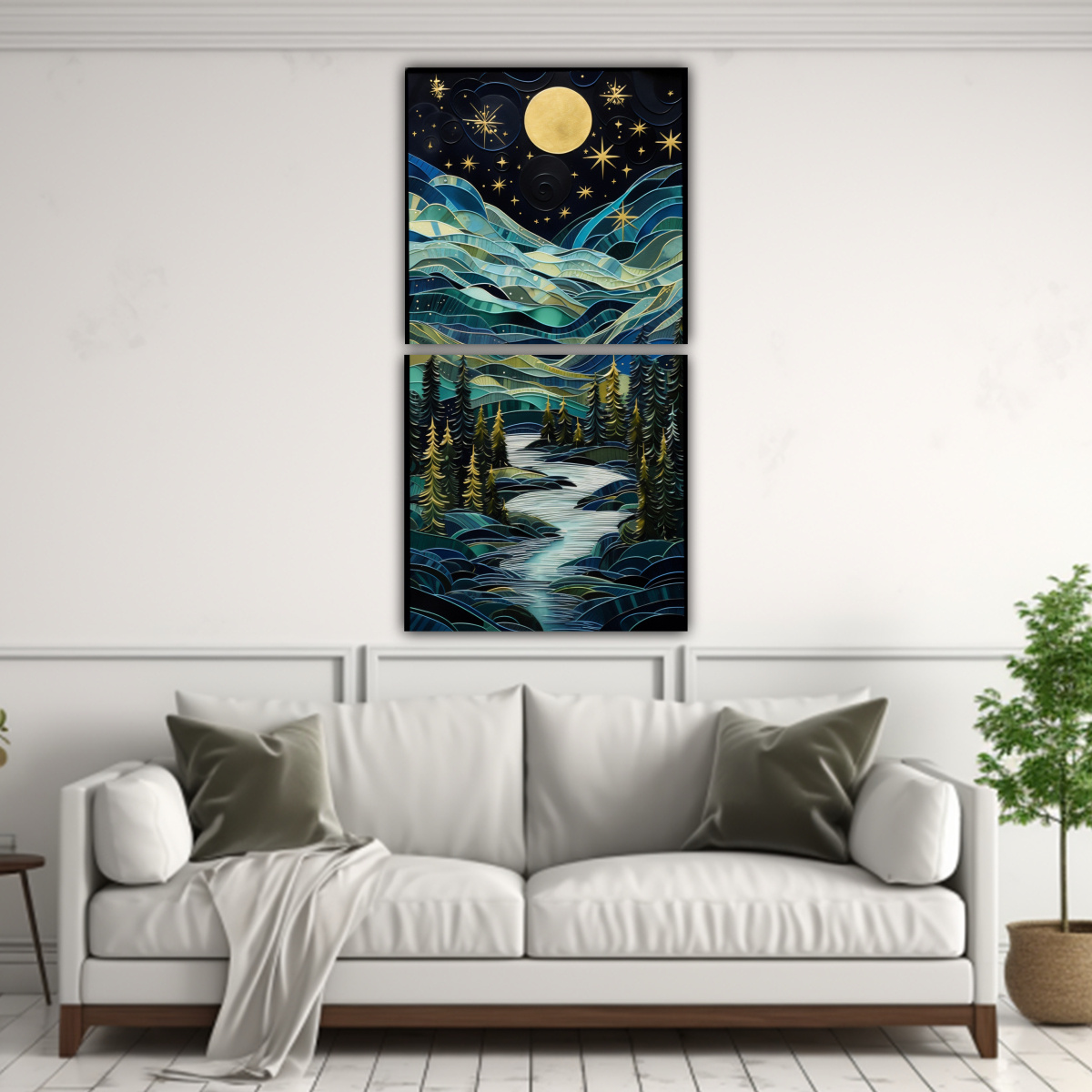 Set 2 Pinturas Acuarela Paisaje Abstracto Montañas Medianoche Con Detalles Dorados