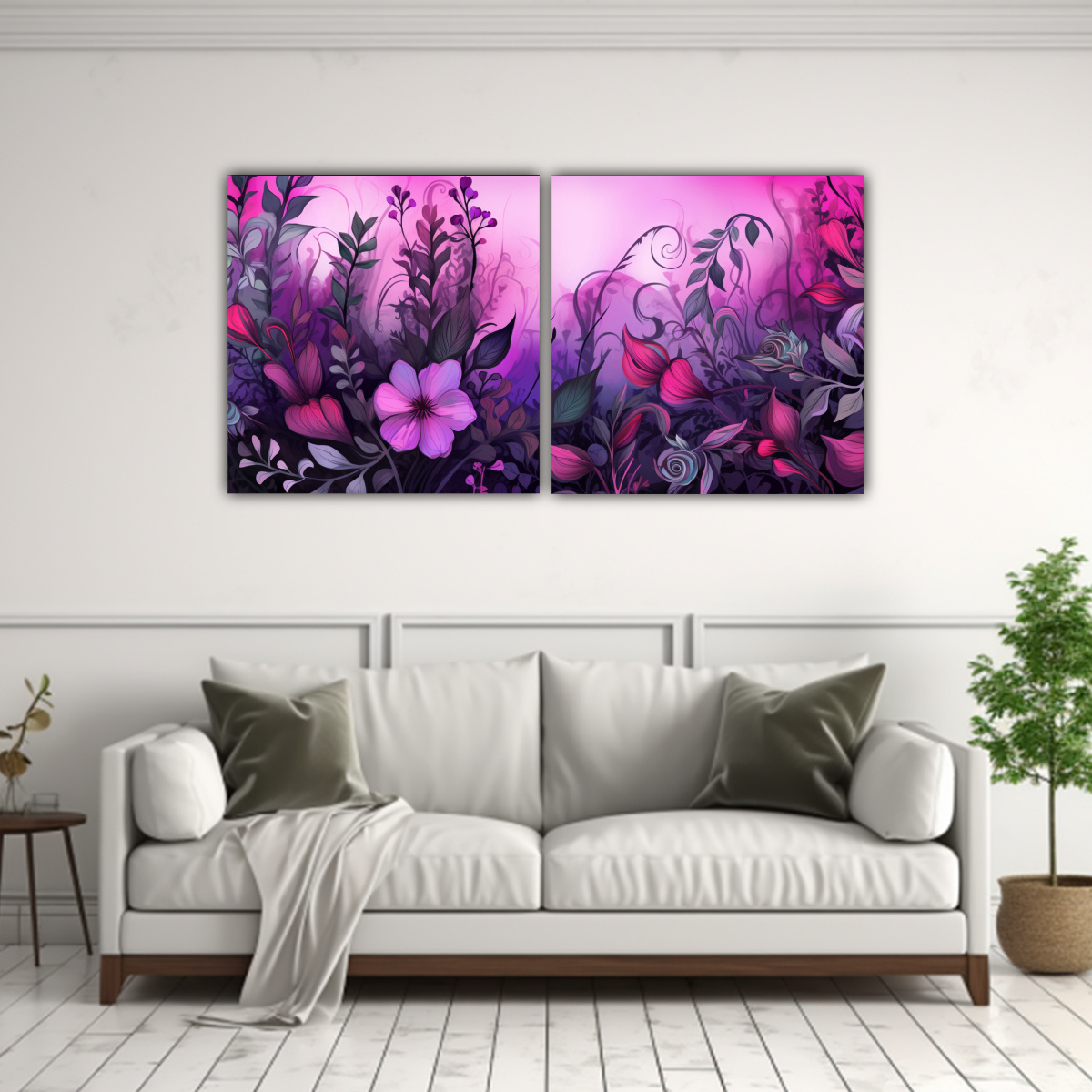 Este set de cuadros de vanguardia fantasía con hierbas moradas y rosadas lucirá espectacular en tu sala de estar o en el dormitorio principal Combínalos con muebles en tonos neutros como el gris y el blanco, y agrega algunos cojines en tonos rosados o morados para crear una atmósfera armoniosa y elegante