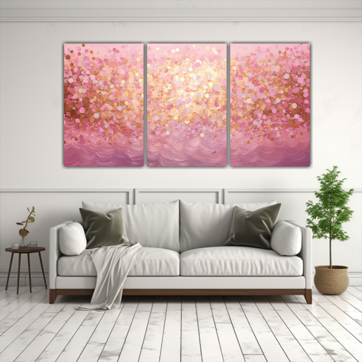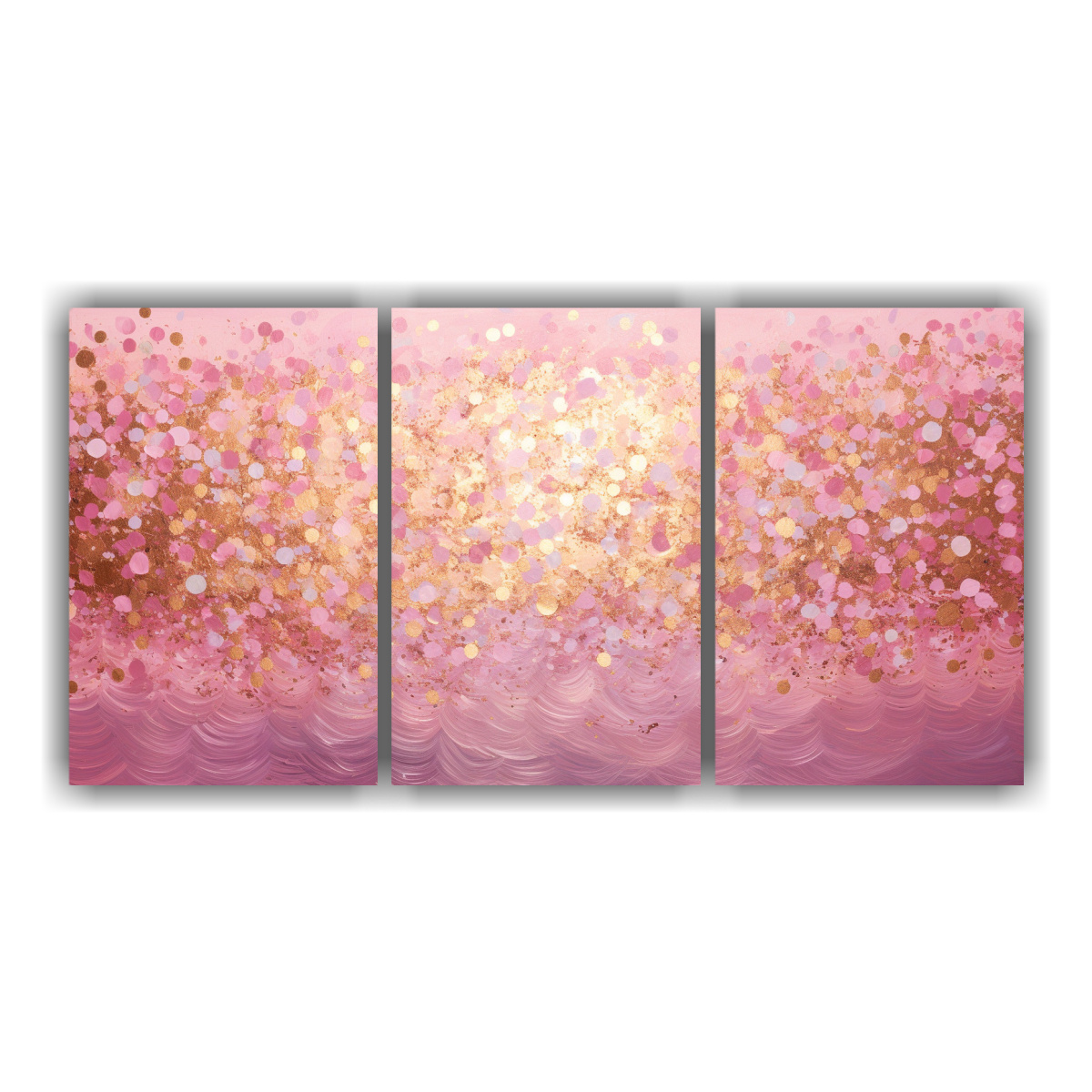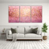 Este cuadro se verá espectacular en tu sala de estar Coloca el Set 3 Artes Tema Efecto visual estilo puntillismo luminoso de líquidos sobre el sofá principal para crear un punto focal en la habitación Sus colores vibrantes, como el Rosado Claro, Carmesi y Dorado, añadirán calidez y elegancia a tu espacio