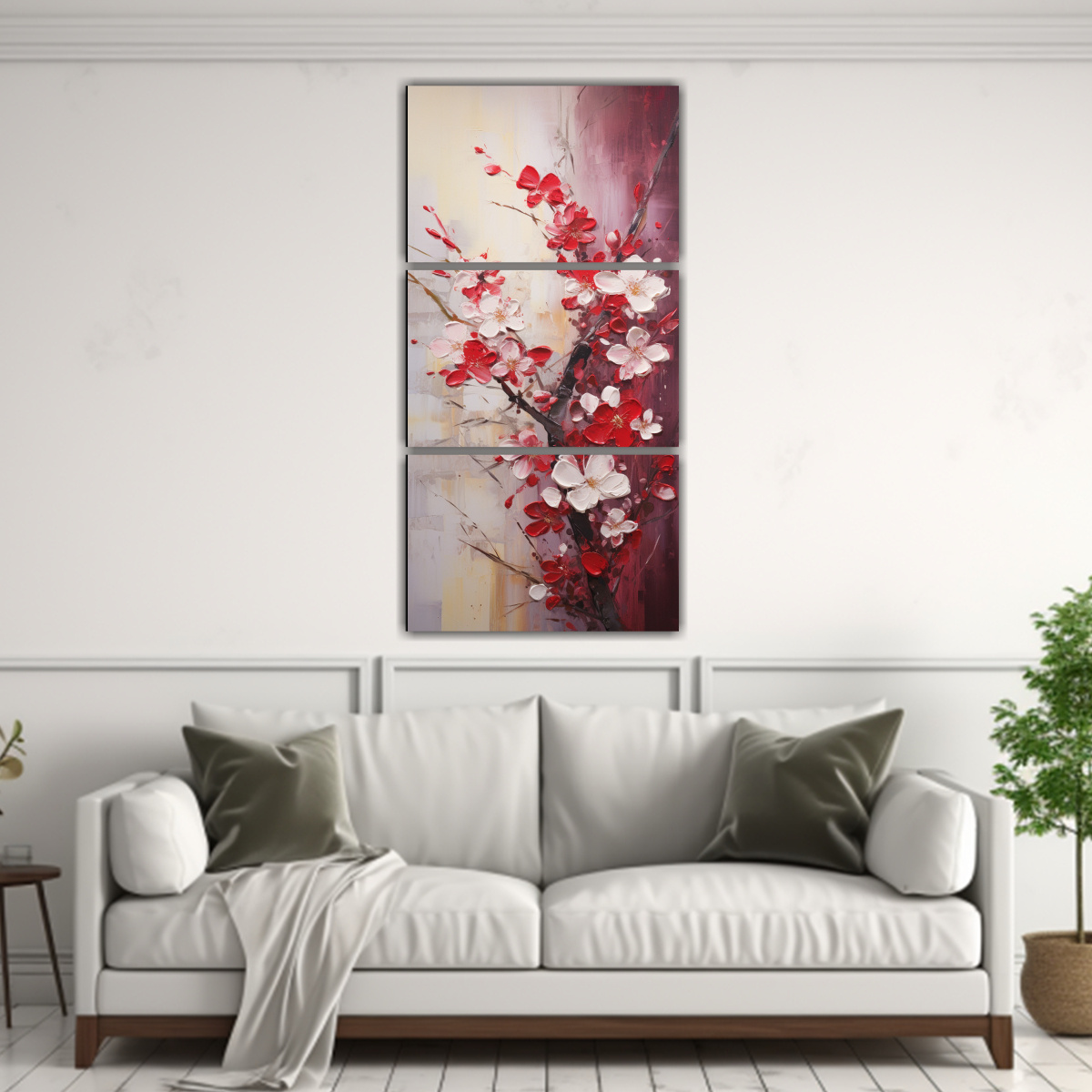 Set 3 Composiciones Abstracto Intenso: Pintura De Cerezos En Flor Rojos Sobre Lienzo En La Decoración De Interiores