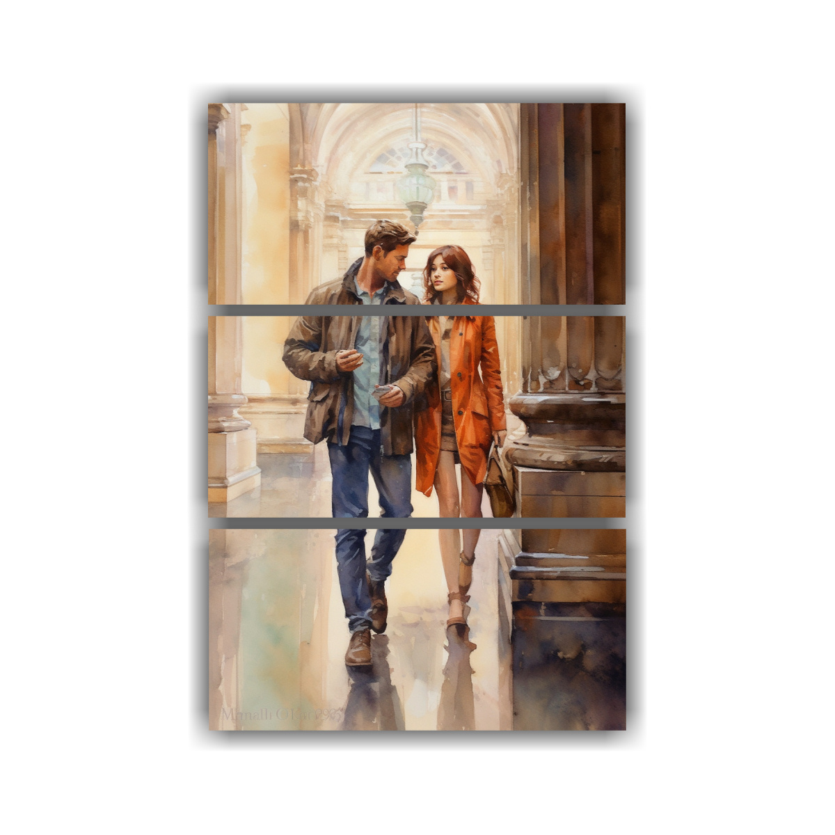 Set 3 Cuadros En Bastidor Brillante De Tela Pareja Y Niña En Tour Por Museo Tonos Delicados Acuarela
