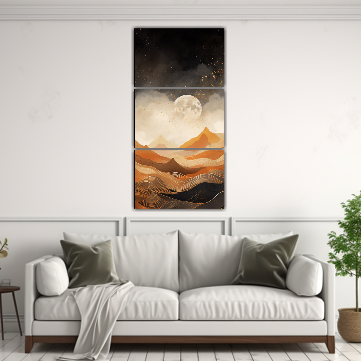 Coloca el Set 3 Pinturas Decor Mural Paisaje montaña en tu sala de estar para crear un ambiente relajante y sofisticado Combínalo con muebles en tonos neutros y accesorios dorados para resaltar los colores del cuadro También puedes colocarlo en tu dormitorio para crear una sensación de calma y tranquilidad ¡Las posibilidades son infinitas!