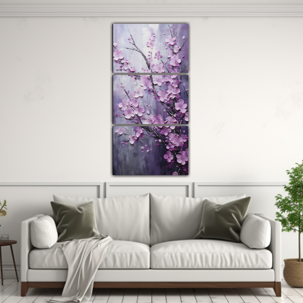 Este hermoso set de 3 Telas en Bastidor Alta Calidad Escenario Flores Cerezo Morado Pintura sobre lienzo es perfecto para decorar tu sala de estar o comedor Te recomendamos colocarlo sobre un mueble de color blanco o crema para resaltar los tonos plateado, azul marino grisáceo, dorado, gris y lila del cuadro Además, puedes complementar la decoración con cojines en tonos morados o lila para crear una armonía visual en el espacio ¡Atrévete a darle un toque de elegancia y sofisticación a tu hogar con este exclusivo cuadro de DecoCuadros!