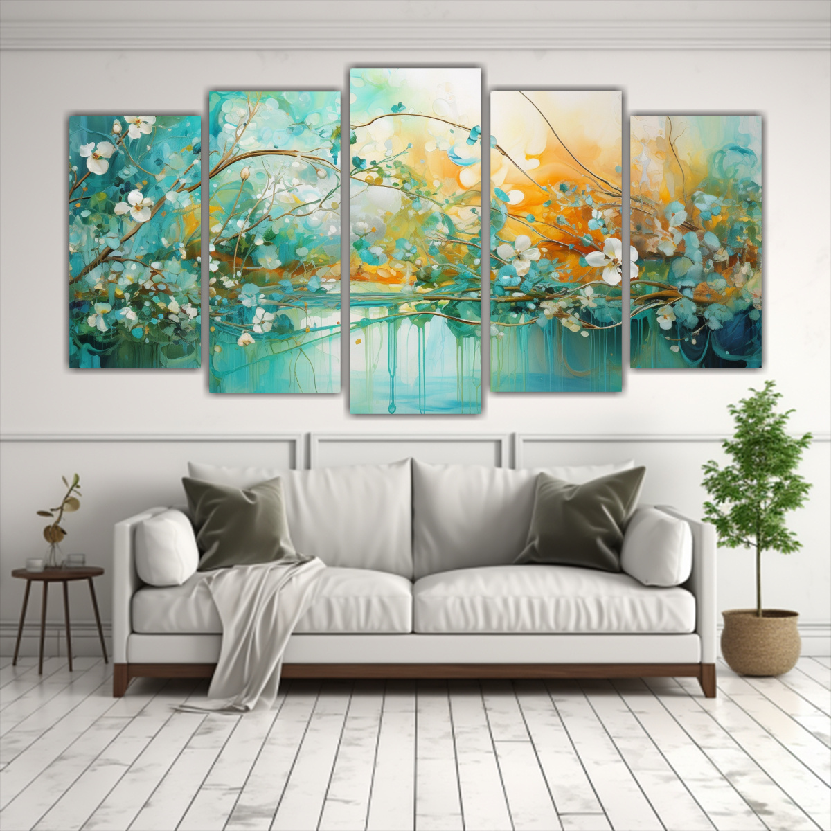 Set 5 Cuadros Calidos De Lienzo En Verde Y Dorado Estilo Representación