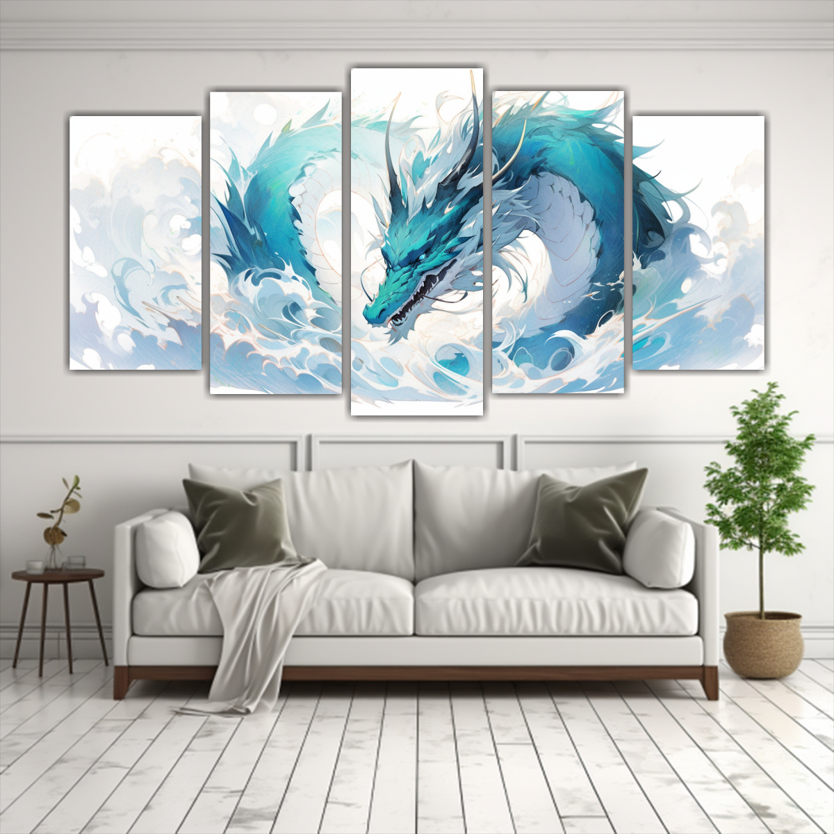 Coloca el Set 5 Cuadros Canvas Patron Intenso de un Dragón en Acuarelas y Colores Turquesa Arte Neo Pop en el salón o en la sala de estar para crear un ambiente moderno y vibrante Combina con muebles en tonos neutros y elementos decorativos en verde azulado y turquesa para resaltar su diseño exclusivo