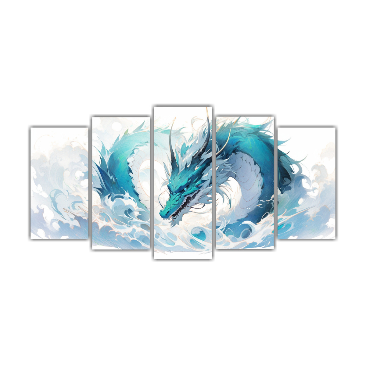 Set 5 Cuadros Canvas Patron Intenso De Un Dragón En Acuarelas Y Colores Turquesa Arte Neo Pop