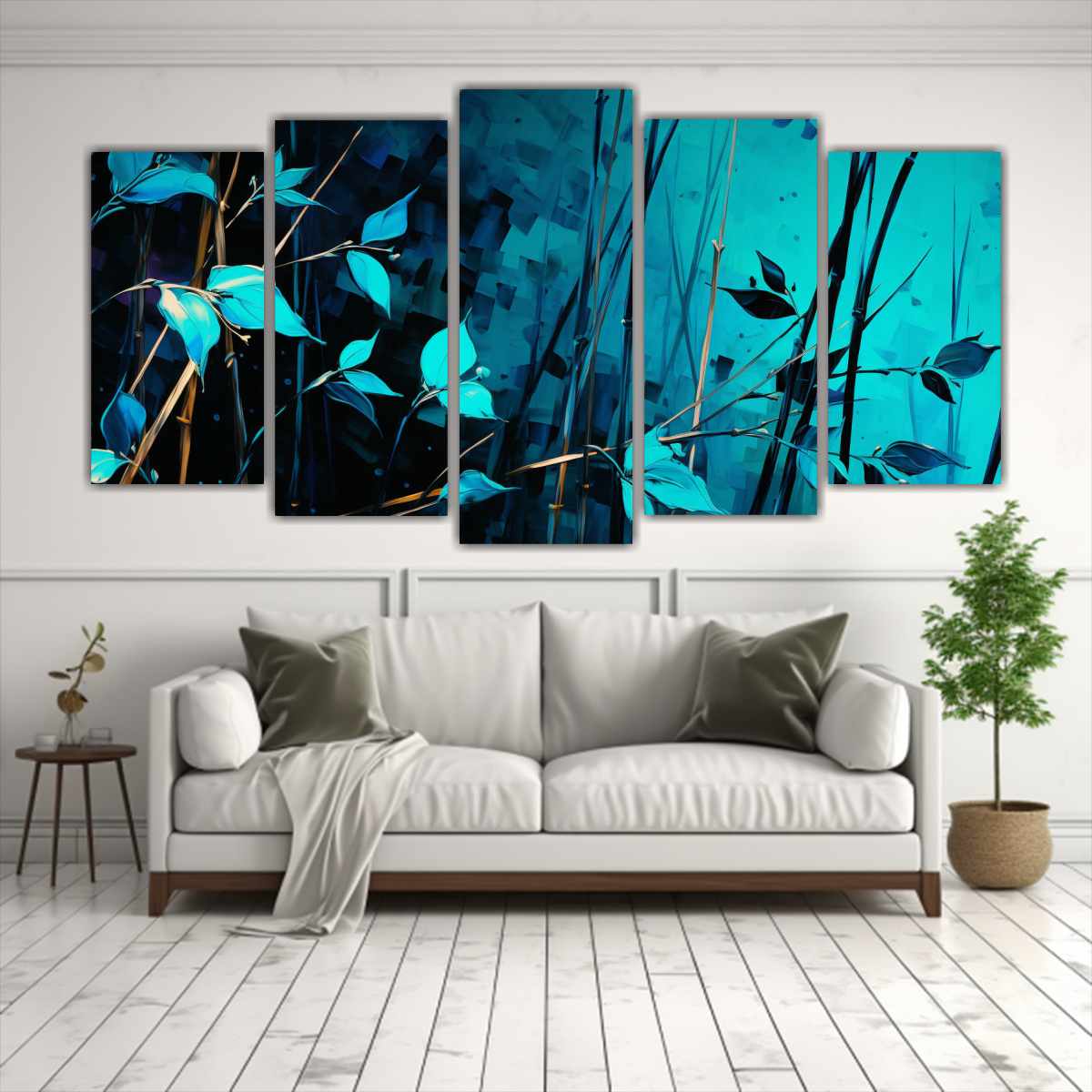 DecoCuadros te presenta el Set de 5 Lienzos de Tela en Tonos Turquesa Estos lienzos impresos en tela de alta calidad con bastidores de madera, combinan los colores cian, verde azulado, plateado, negro, azul marino grisáceo, chocolate, menta y gris Con diseños exclusivos y una temática neo-noir, le darán a tu espacio un toque de creatividad y elegancia