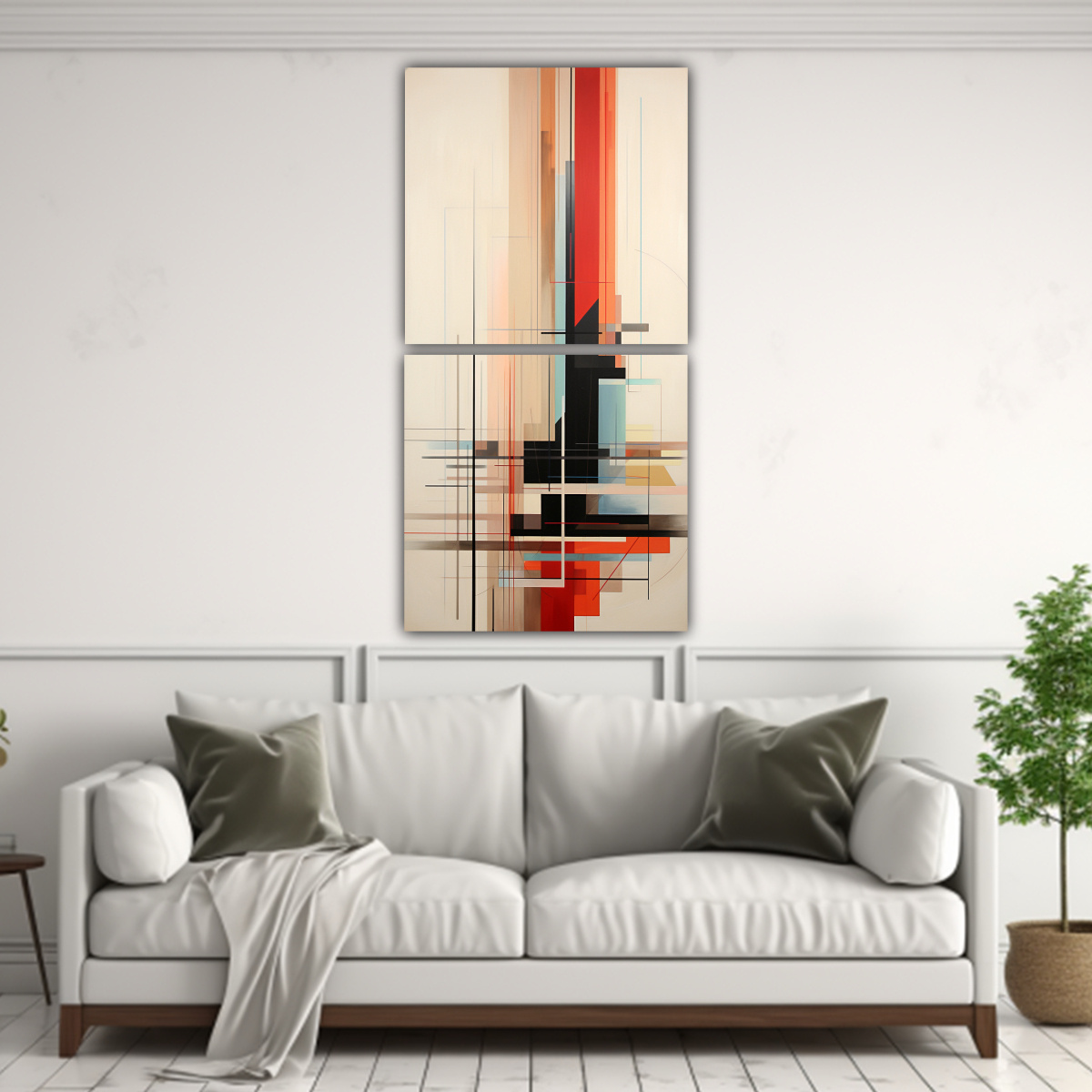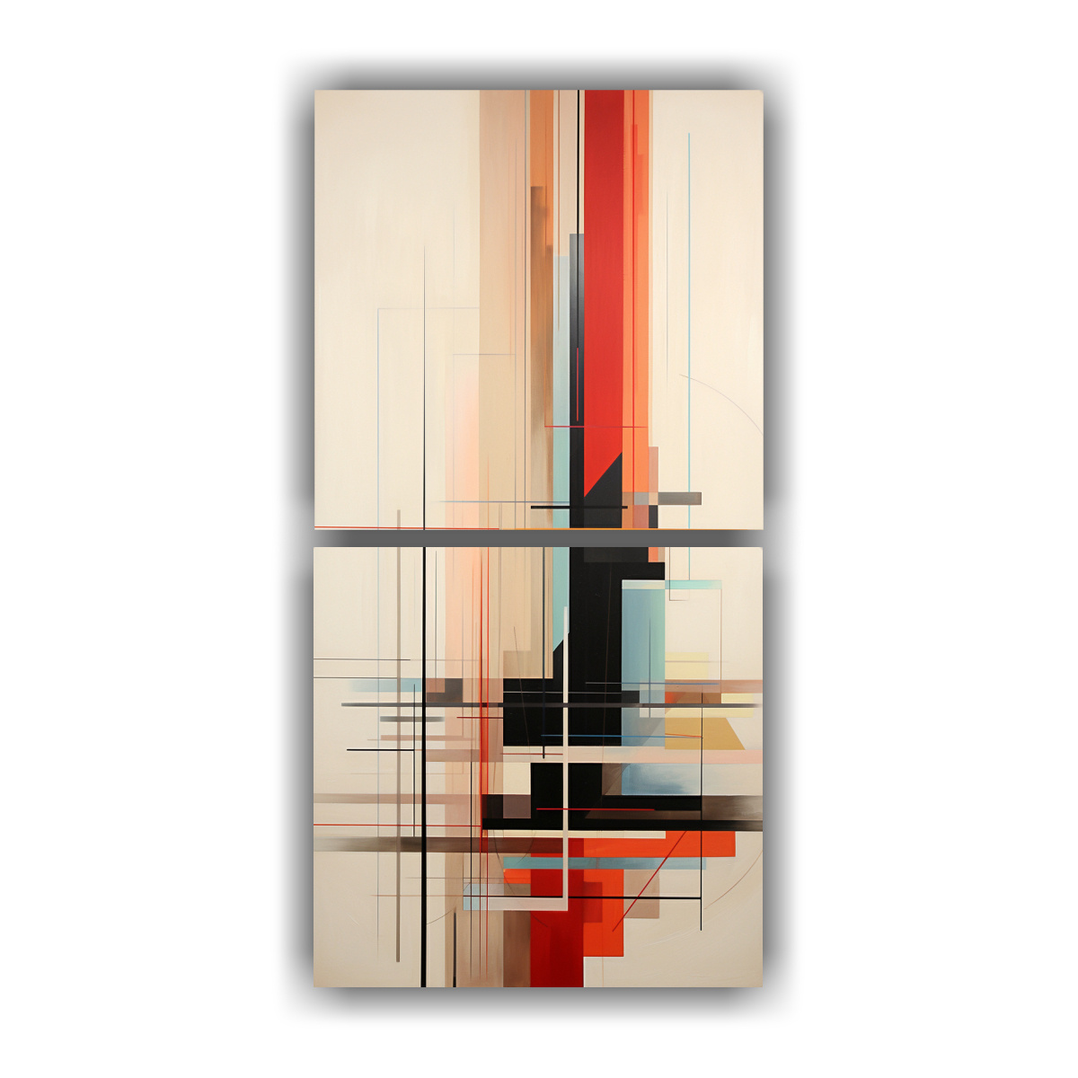 Decora tu hogar con el Set de 2 Lienzos de Tela Abstractos con Lineas Rectas en Estilo Galería de DecoCuadros Composición equilibrada de colores en tonos Azul Marino grisaceo, Beige, Carmesi, Coral, Plateado y Gris Diseños exclusivos y entrega rápida