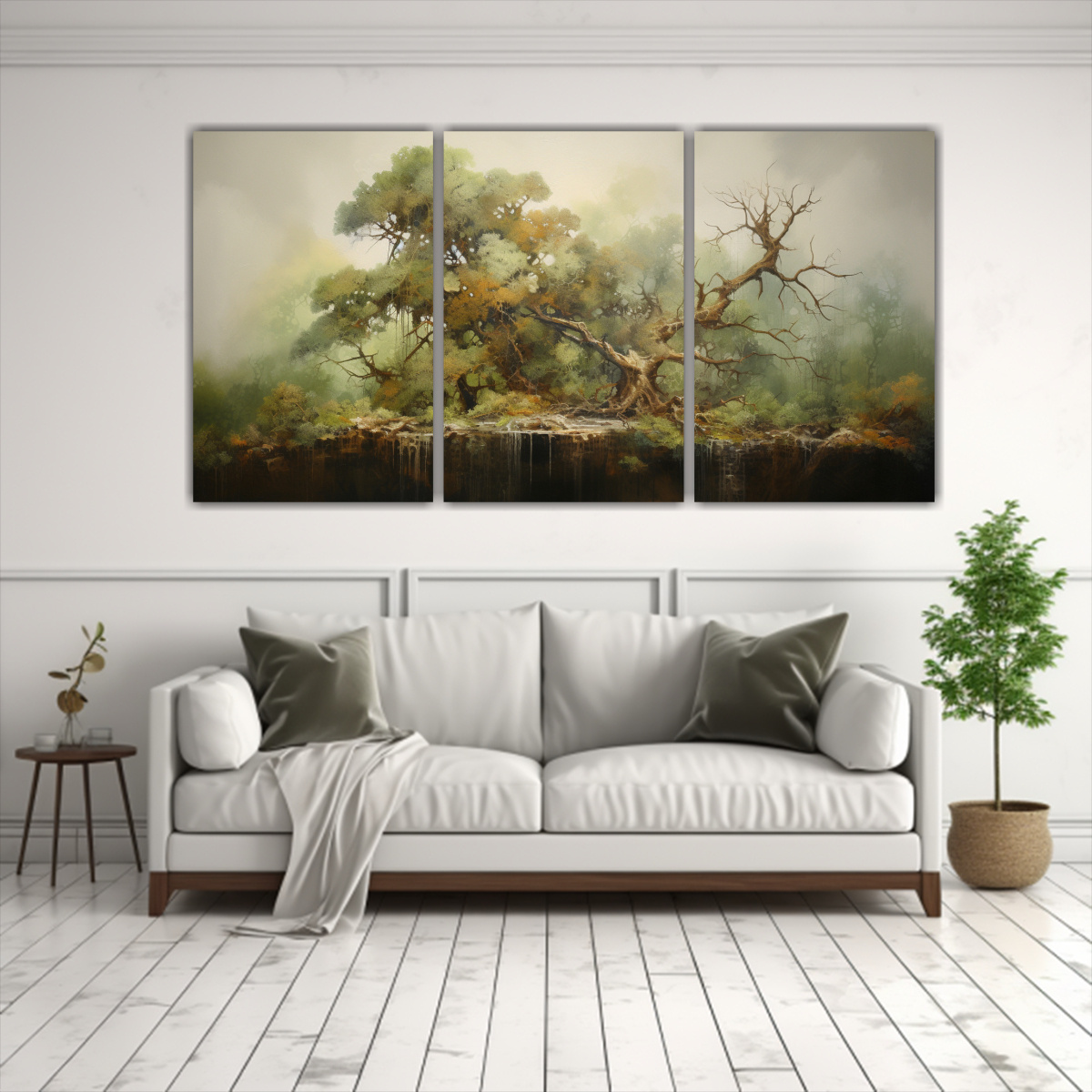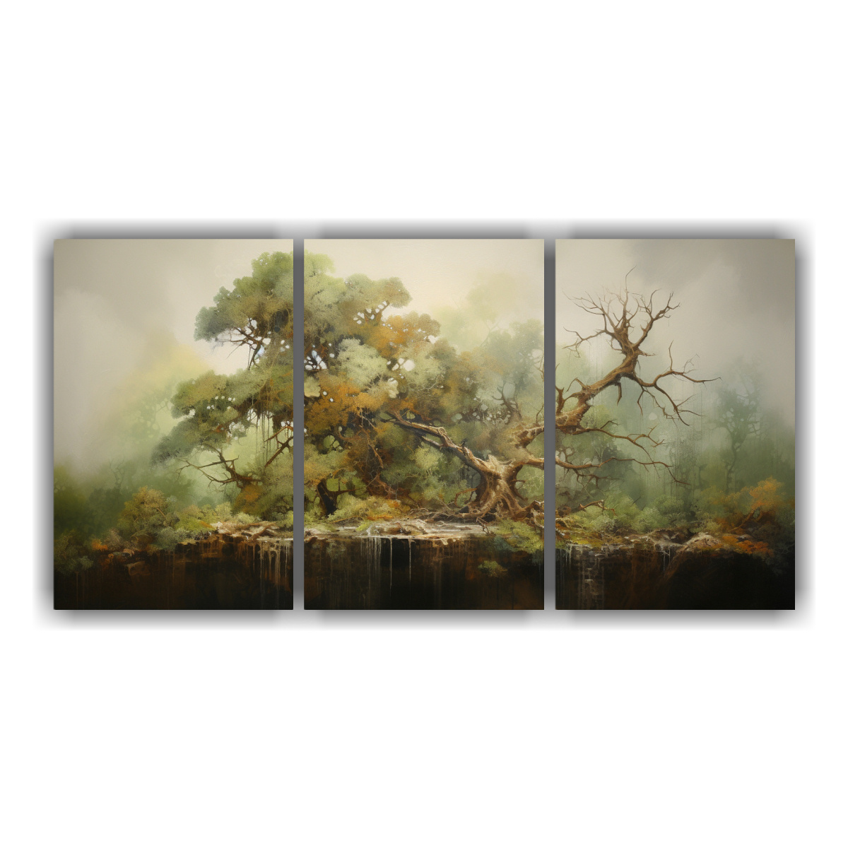 Set De 3 Cuadros De Acuarela Arte Gráfico De Un árbol En Un Bosque, Estilo Abstracto, Pintura Detallada Al óleo