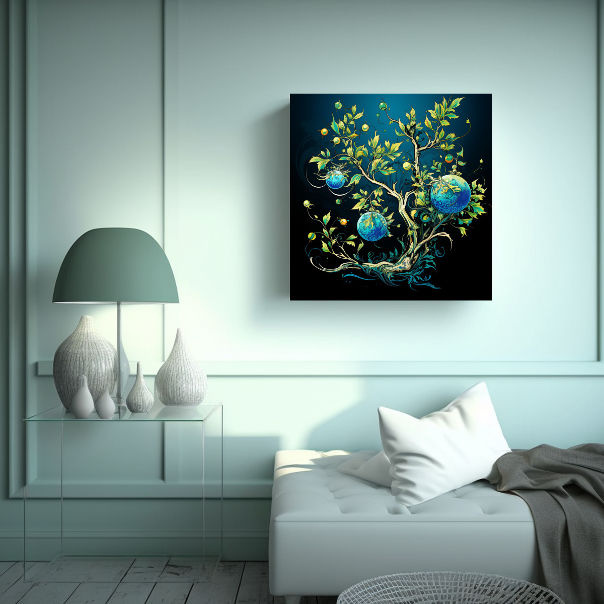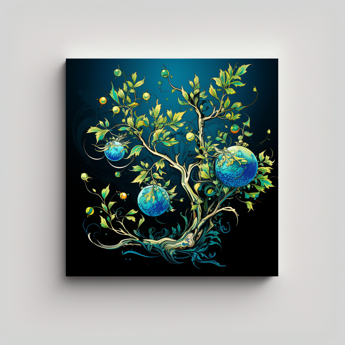 El cuadro de tela de acuarela Fantasía Pomegranate Tree en verde y azul es perfecto para crear un ambiente único en tu hogar La combinación de colores como el amarillo claro, menta, verde azulado, negro, azul marino grisáceo, beige y chocolate, le dará un toque de elegancia y sofisticación a cualquier habitación
