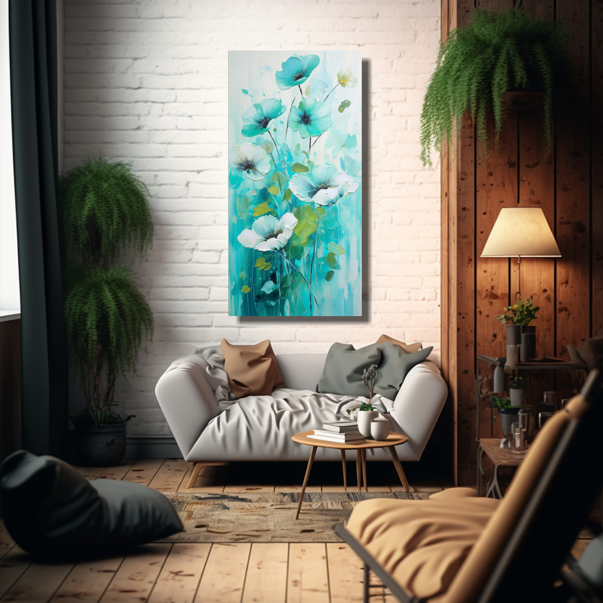 Este cuadro Belleza Verde y Turquesa sería perfecto para decorar una sala de estar con colores neutros y tonos tierra Colócalo sobre un sofá gris o beige, junto a cojines y cortinas en tonos turquesa y verde azulado Complementa el ambiente con plantas de interior para resaltar la belleza de la pintura de flores El cuadro añadirá un toque de frescura y estilo a tu espacio