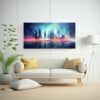 Este cuadro de paisaje urbano en acuarela se vería espectacular en la sala de estar, colocado sobre un mueble de color neutro como blanco o gris para resaltar sus tonos vibrantes También puedes combinarlo con cojines en los mismos colores para crear una armonía visual en el espacio Otra idea es colocarlo en el dormitorio, sobre la cabecera de la cama, para darle un toque moderno y relajado No importa dónde decidas ponerlo, este cuadro será el centro de atención y le dará un toque único a tu decoración