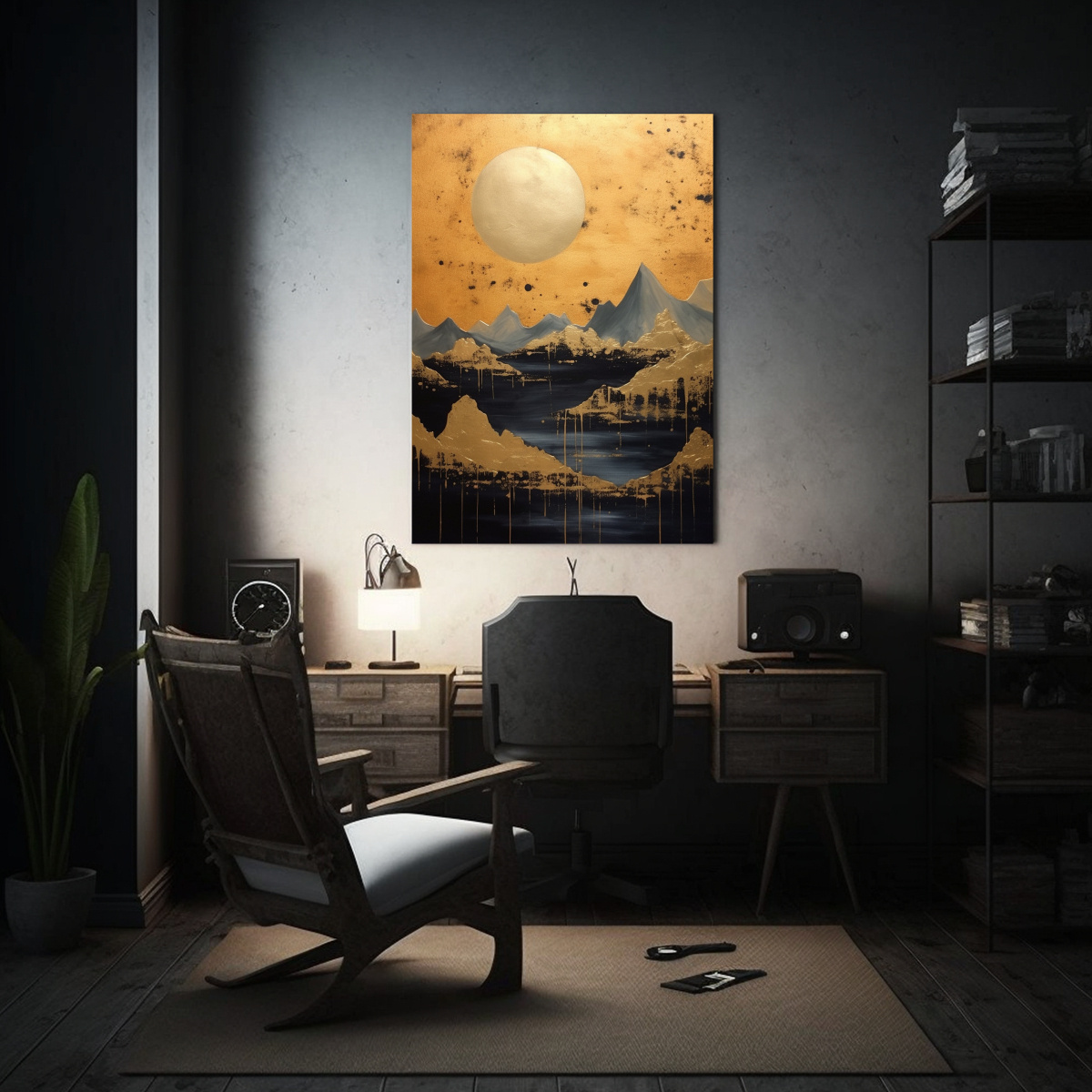 Este cuadro estético en tela muestra un hermoso paisaje de montañas nocturnas con fases lunares y detalles en oro Con colores como el negro, coral, gris, amarillo claro, azul marino grisáceo y chocolate, este cuadro le dará un toque elegante y sofisticado a cualquier espacio de tu hogar