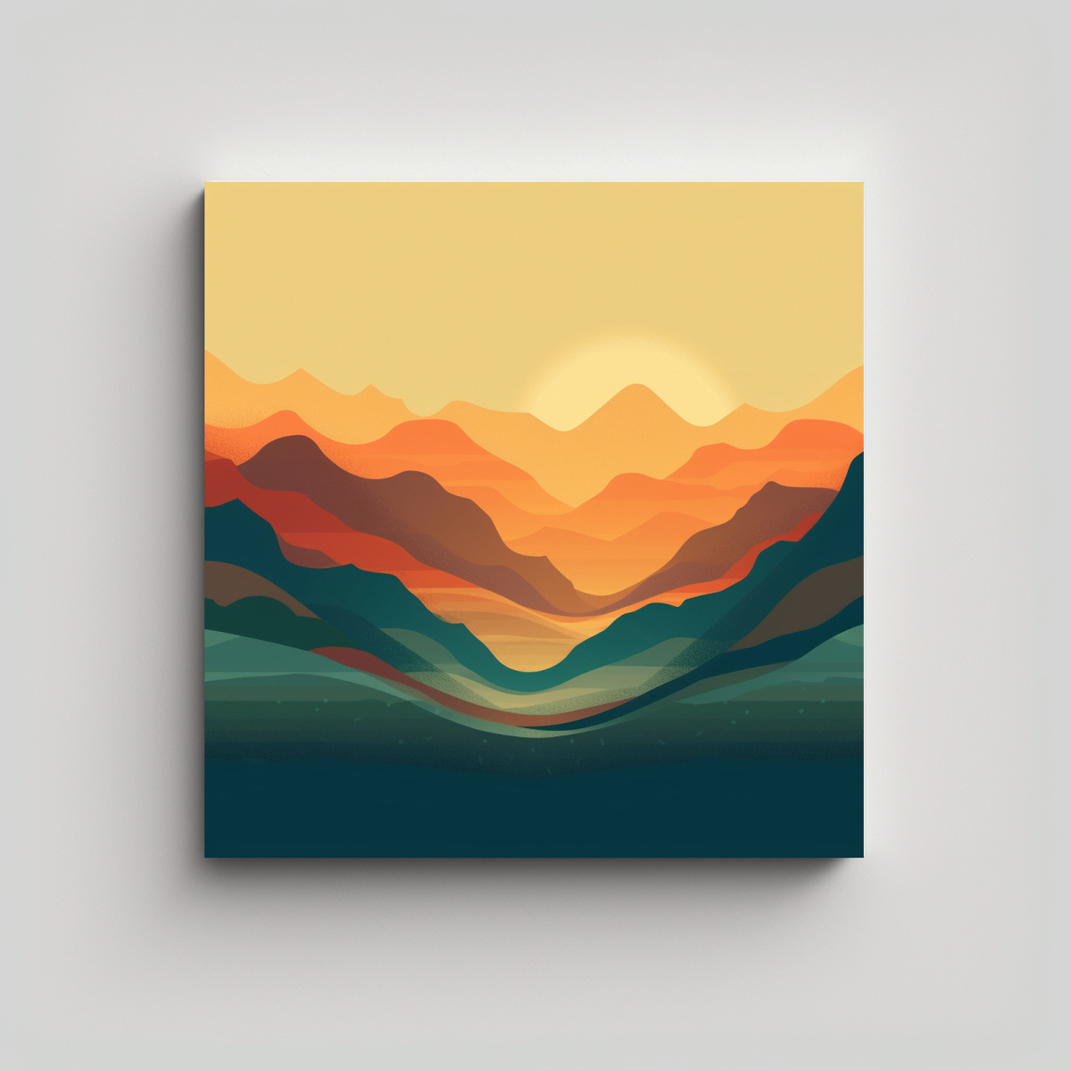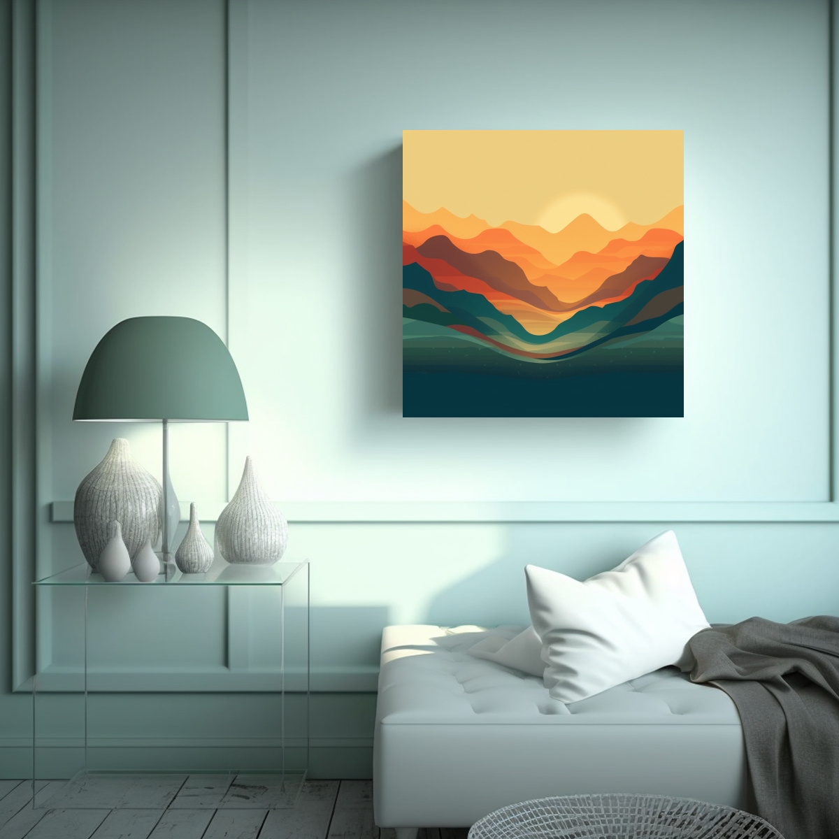 DecoCuadros te ofrece el cuadro Tela en Bastidor Paisaje Montañas Otoño Retro Gráfico con colores Azul Marino grisaceo, Carmesi, Amarillo Claro, Coral y Gris Diseño exclusivo y entrega rápida