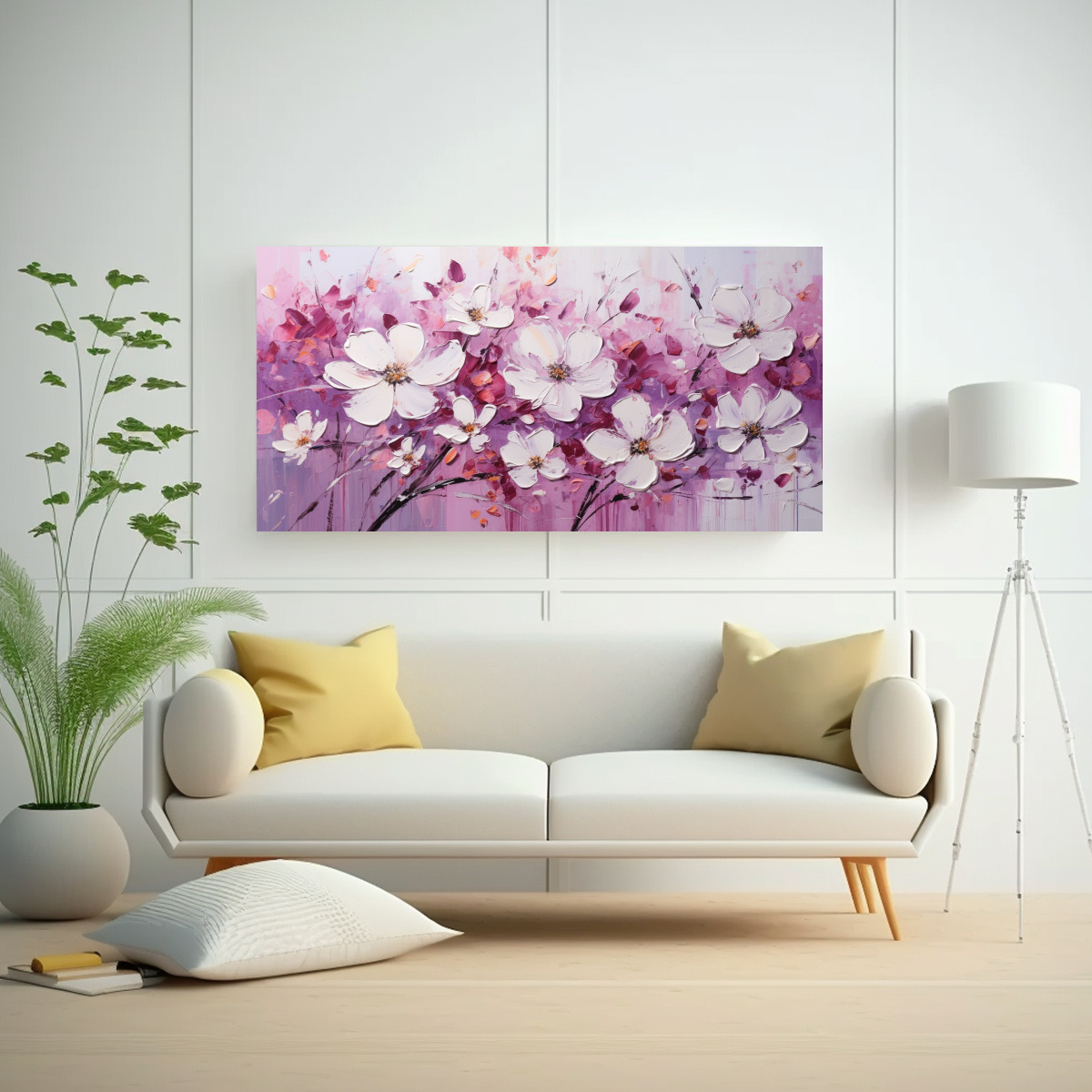 Tela En Bastidor Vanguardia Elegante Con Flores Blancas Y Magentas En Pintura Sobre Lienzo