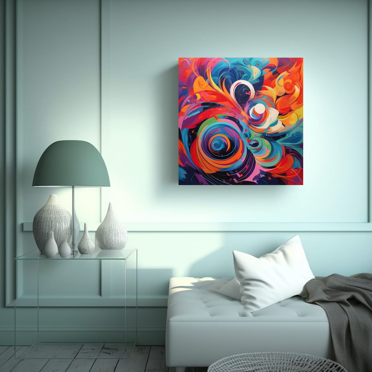 Este cuadro encajará perfectamente en una sala de estar moderna o un estudio creativo Puedes colocarlo sobre un sofá gris oscuro o una pared blanca para resaltar su diseño caótico y vibrante Complementa la decoración con cojines en tonos plateado, carmesí y turquesa, y agrega toques de verde azulado y menta con plantas en macetas ¡Crea un ambiente lleno de energía y estilo con este cuadro impresionante!