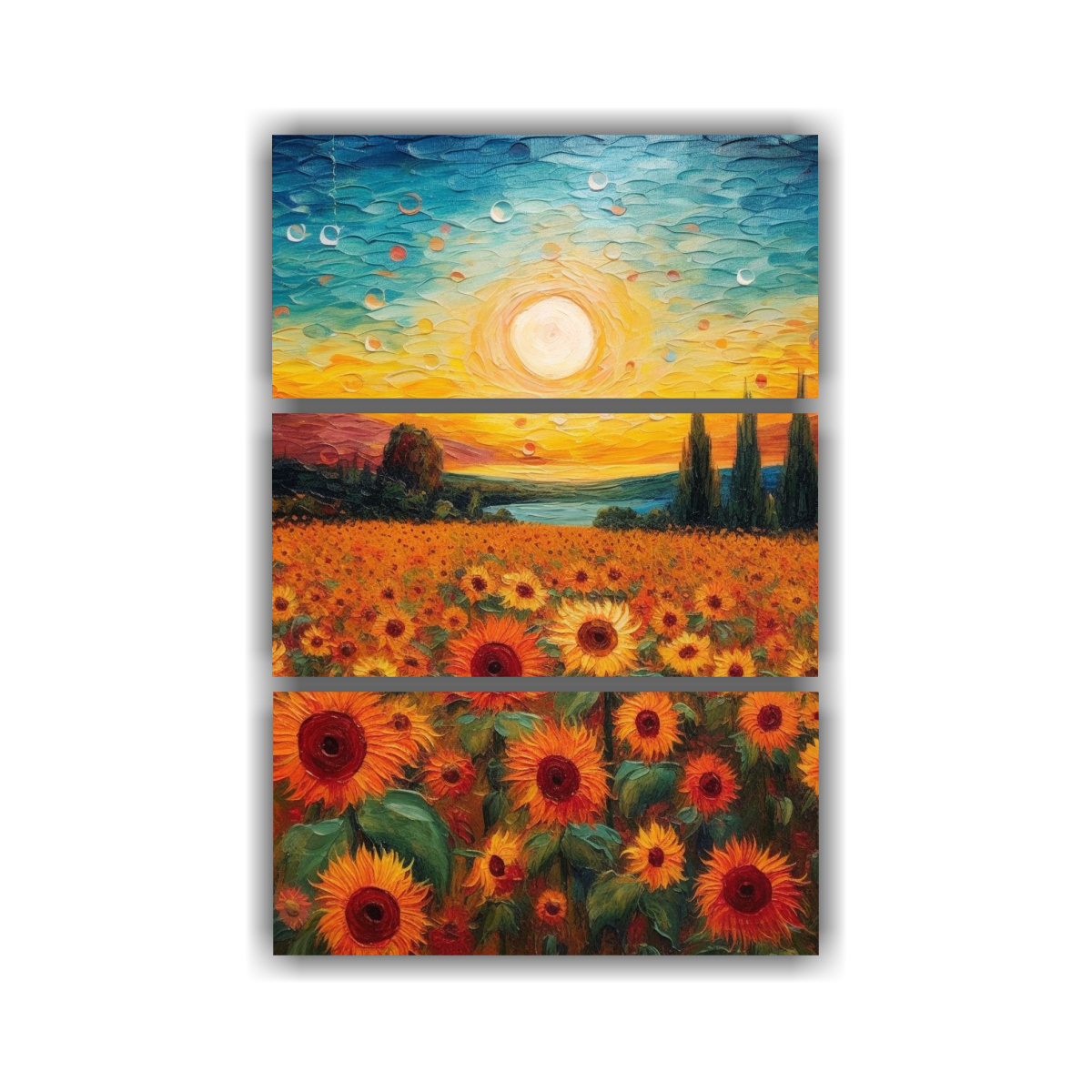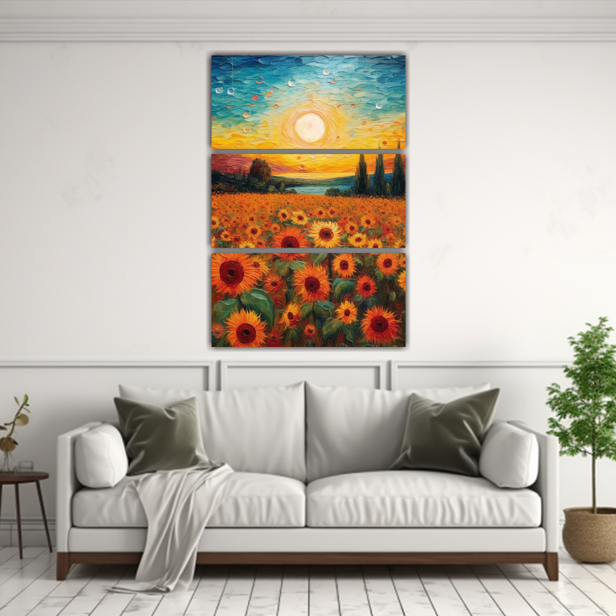 Nuestros cuadros ‘Tres Composiciones Movimiento Armonía’ están inspirados en Vincent van Gogh y son una expresión artística de un campo de pinturas de difusión Disponibles en colores como Azul Marino grisaceo, Plateado, Coral, Turquesa, Chocolate, Marrón, Dorado, Gris y Menta, estos cuadros le darán a tu hogar un toque de elegancia y sofisticación