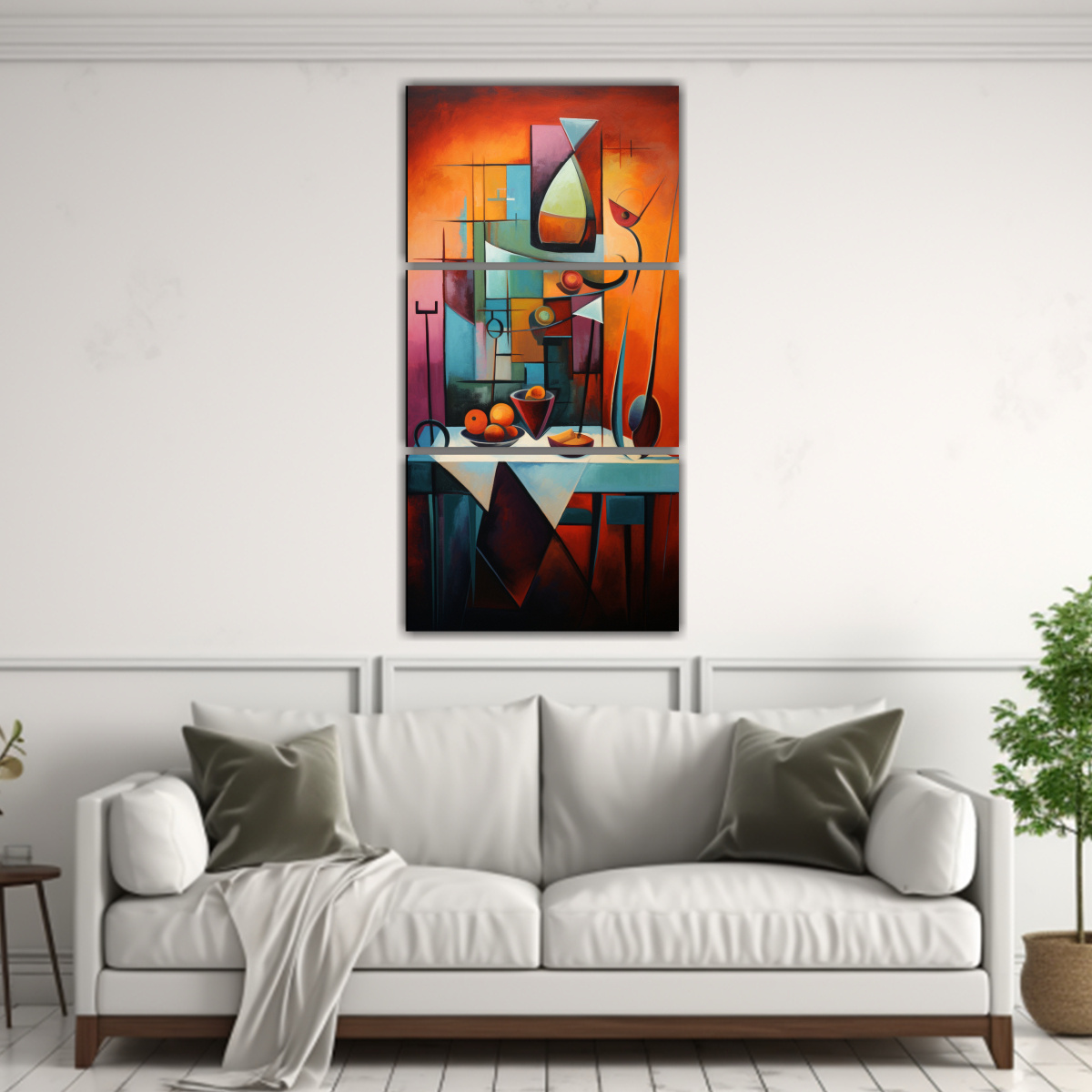 Coloca estos tres cuadros abstractos verticales en tu comedor para crear un ambiente moderno y sofisticado Combínalos con muebles en tonos neutros como blanco o gris, y agrega accesorios en tonos plateado o dorado para darle un toque elegante ¡Impresiona a tus invitados con esta decoración única!
