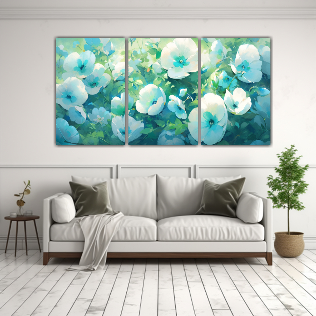 Tres Cuadros Acuarela Minimalismo Flores Verdes Y Cian En Lienzo