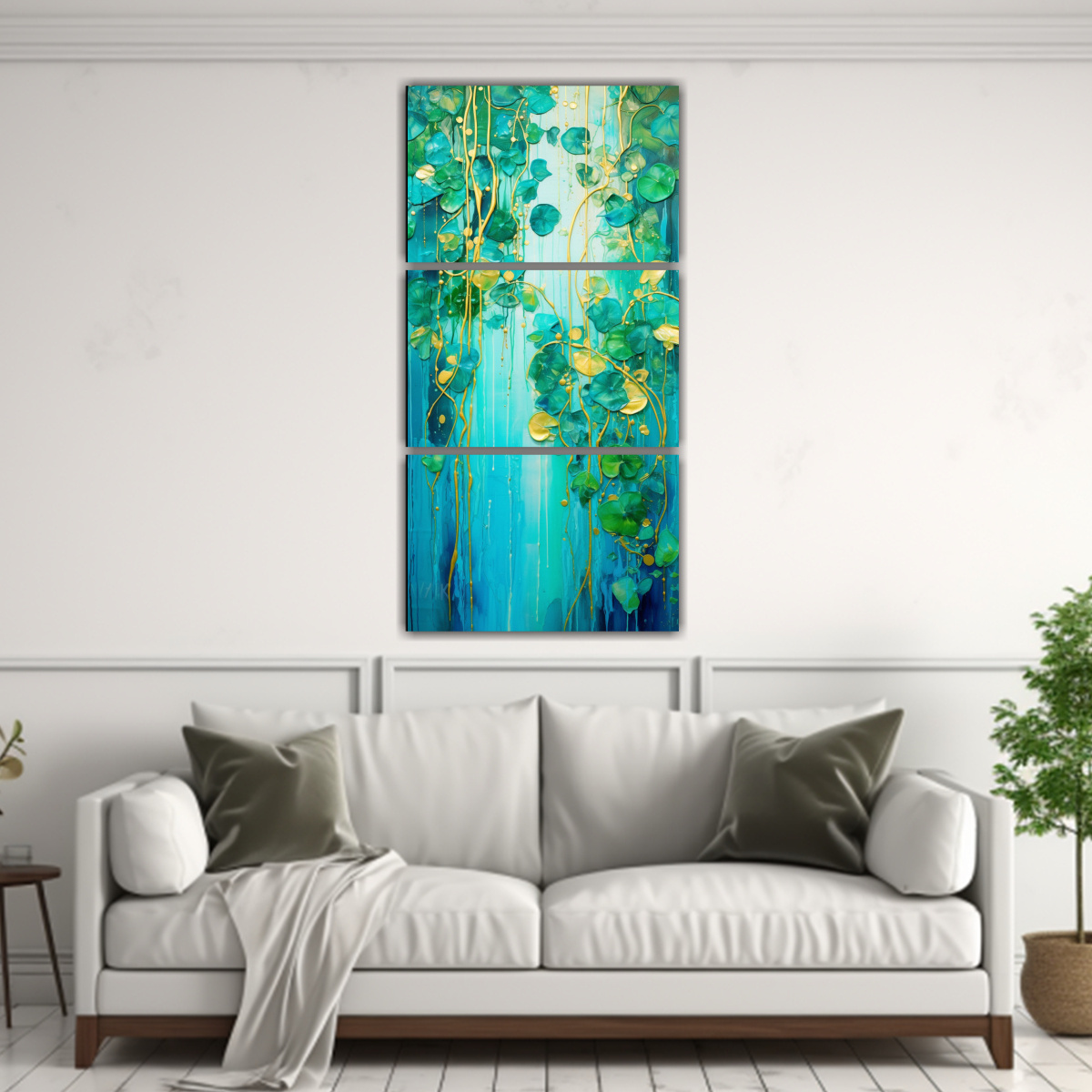 Tres Cuadros Conceptual Profundidad Pintura En Verde Y Dorado Estilo